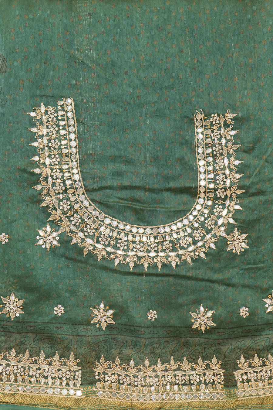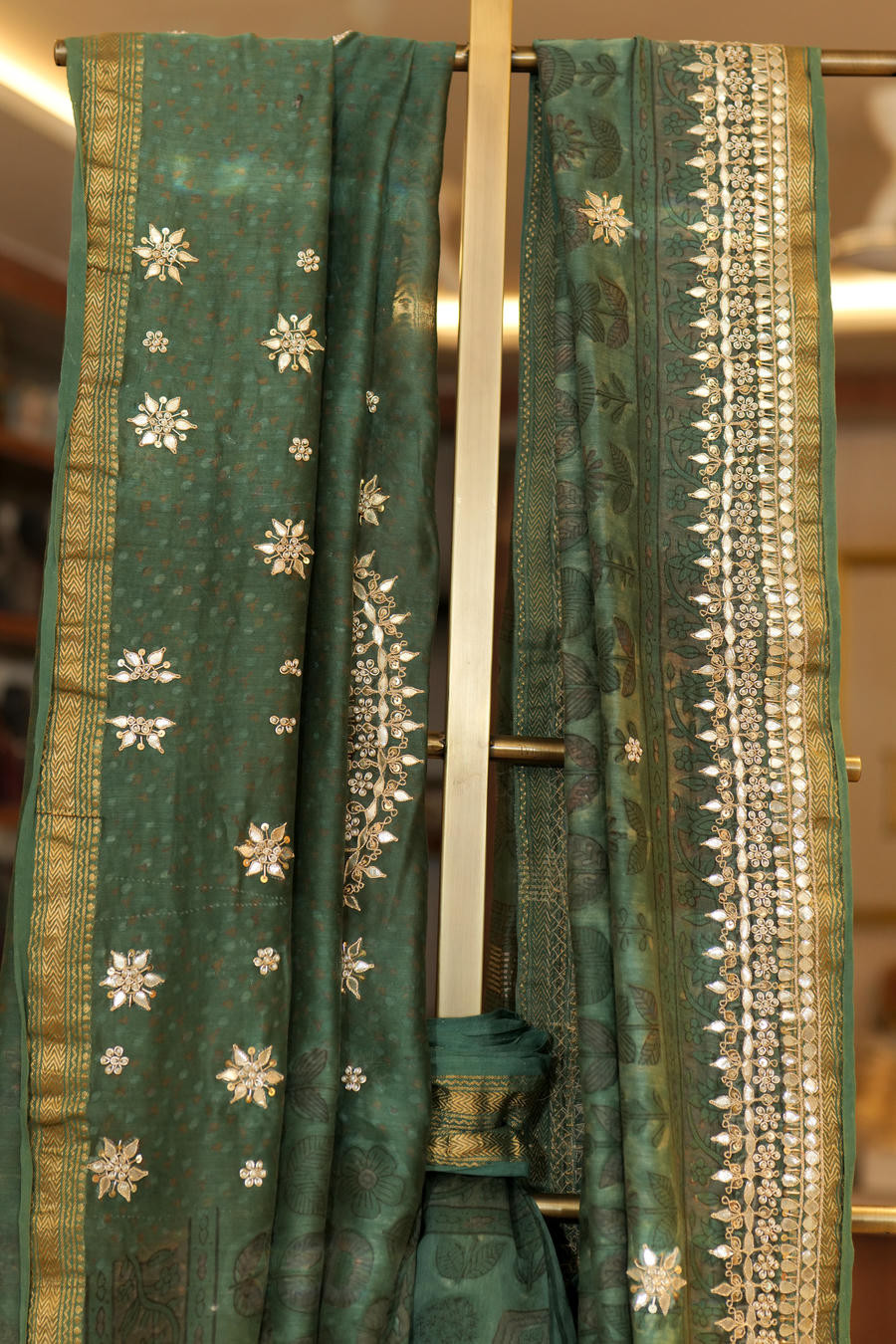 Rooted in the earth and elevated by artistry, Bagh-e-Bagru is a celebration of timeless Bagru craftsmanship infused with delicate handwork. Crafted in a deep, serene forest green hue, this saree carries the quiet elegance of nature and the soul of Rajasthan's age-old textile traditions.