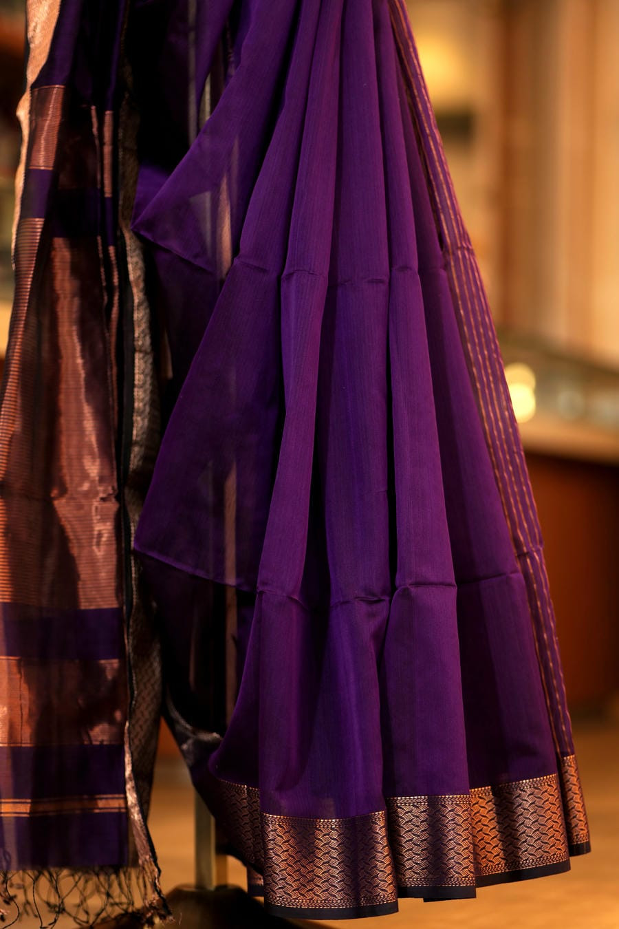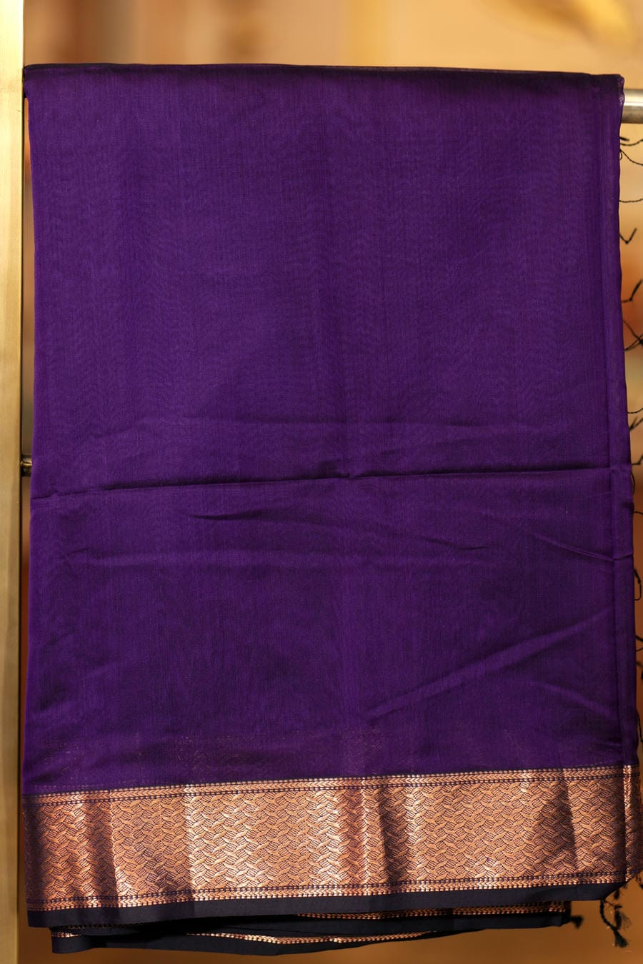 Radiate regality with The Amethyst Aura, a pure Maheshwari saree that embodies timeless sophistication. Draped in a rich shade of royal purple, this masterpiece is elevated with an opulent copper-gold zari border that glimmers with every fold. The lustrous pallu showcases the fine craftsmanship Maheshwari weaves are known for-lightweight, luxurious, and effortlessly graceful.