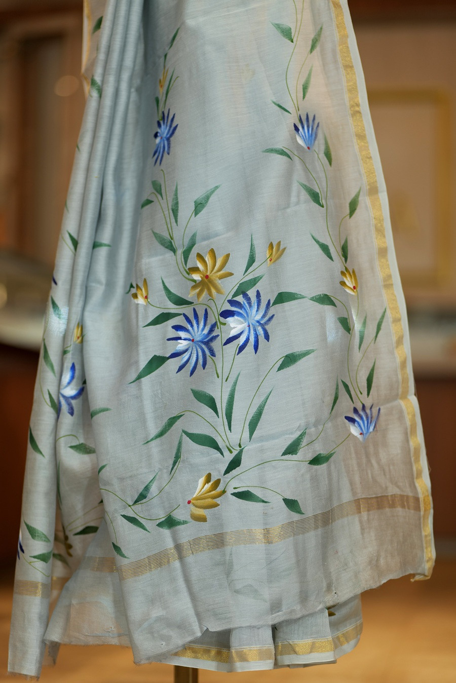 This saree reflects slow craftsmanship and the timeless appeal of hand-painted textiles.