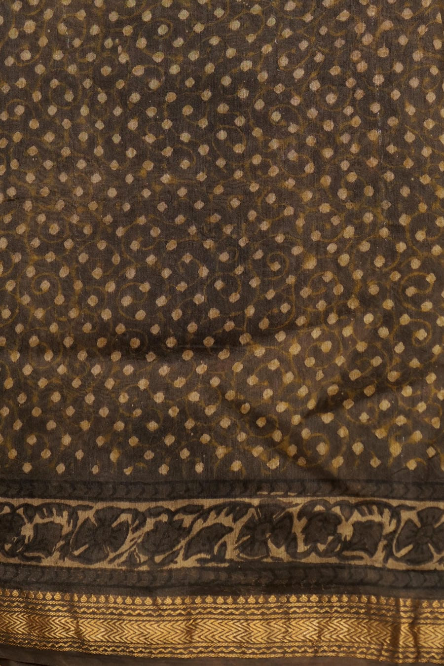 Hand-printed using carved wooden blocks, the surface unfolds with classic Bagru motifs-florals, geometrics, and rhythmic borders-layered thoughtfully across the body, border, and pallu. The interplay of dense and airy patterns lends depth while preserving a graceful balance.