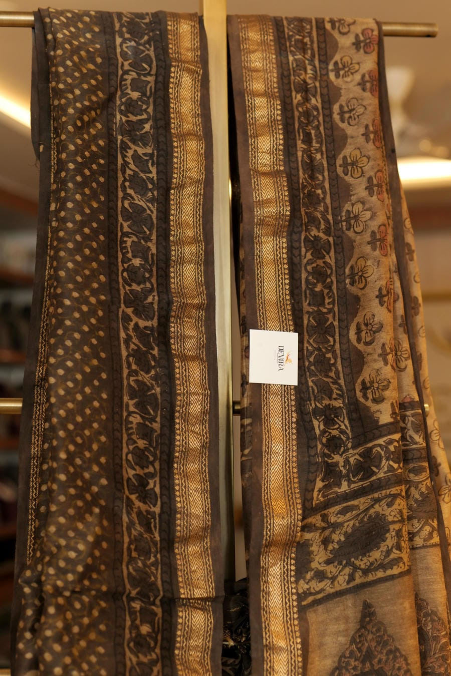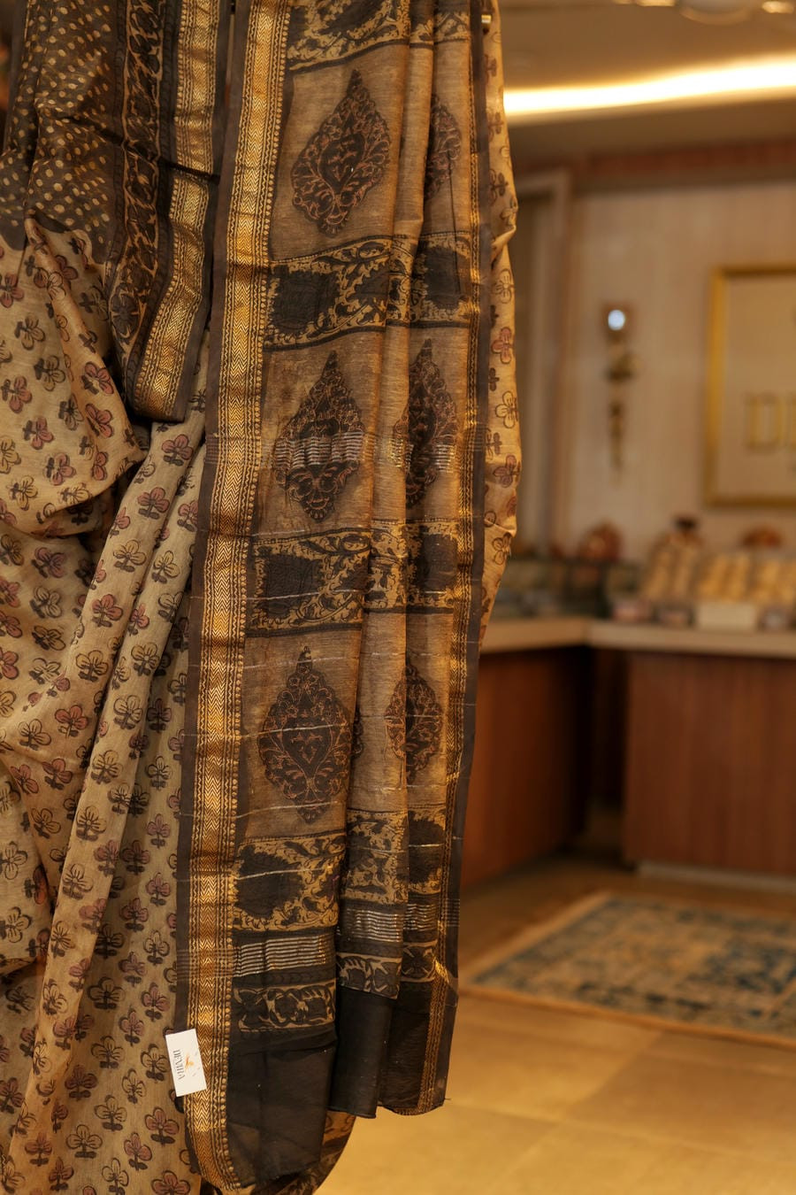 Grounded in heritage and elevated by artisanal detail, Bhumi Anubhav is a tactile journey through Rajasthan's Bagru handblock tradition. The saree carries a warm, earth-toned palette enriched with antique-gold accents, creating a look that feels both rooted and refined.