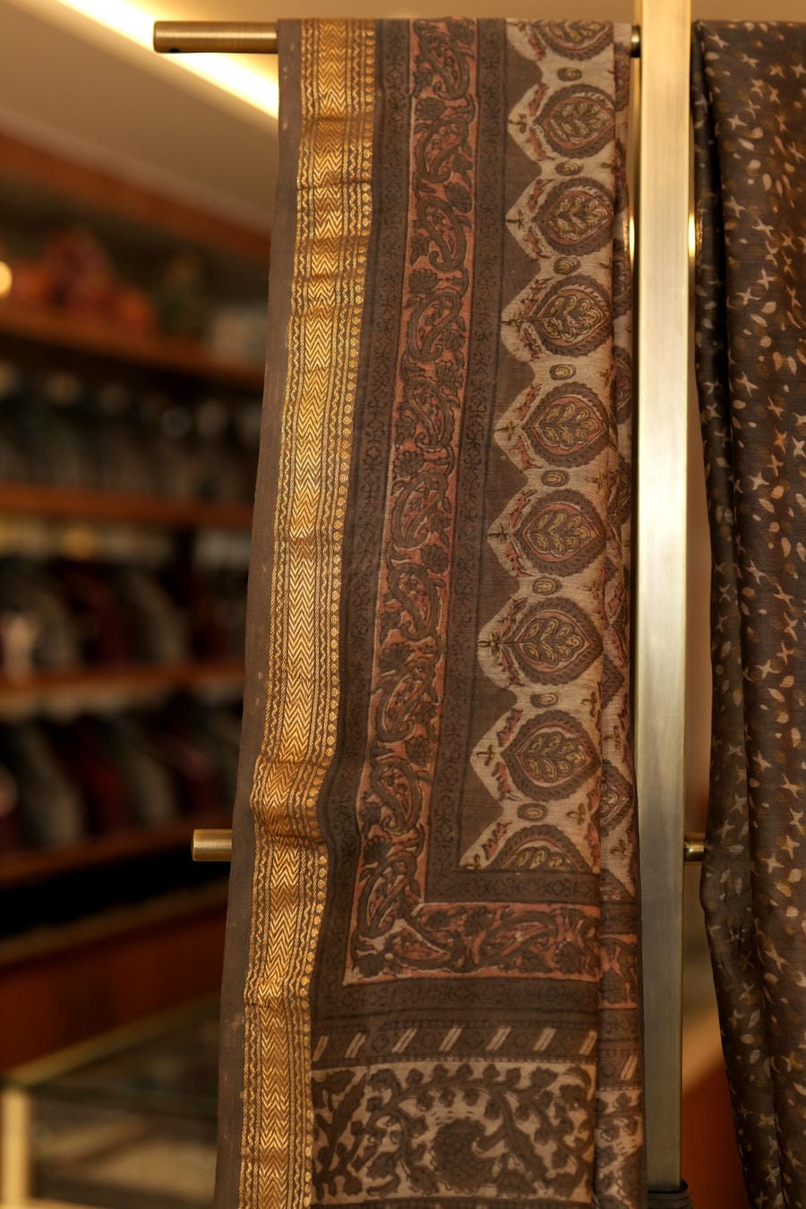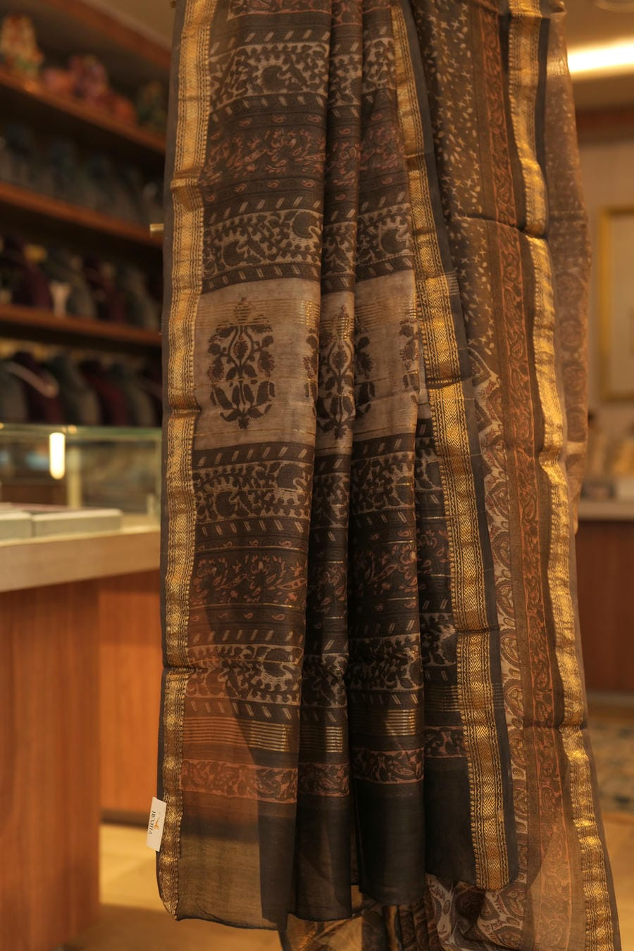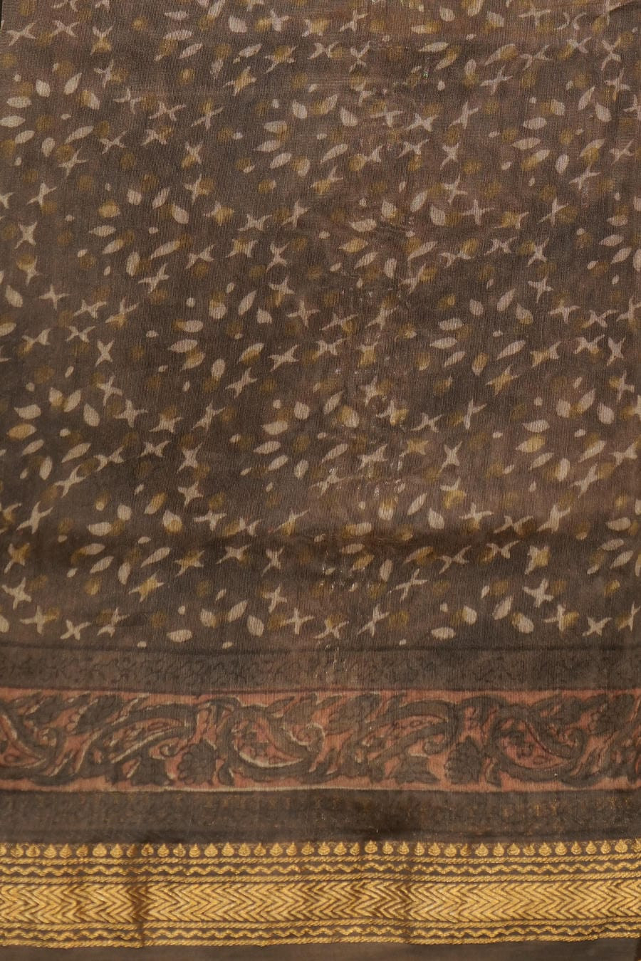Crafted using traditional Bagru handblock techniques, this saree features a harmonious interplay of earthy browns and deep charcoal tones, accentuated by luminous antique-gold borders. The motifs-drawn from age-old Rajasthani design vocabulary-unfold with quiet rhythm across the body, while the richly detailed pallu adds depth and character.