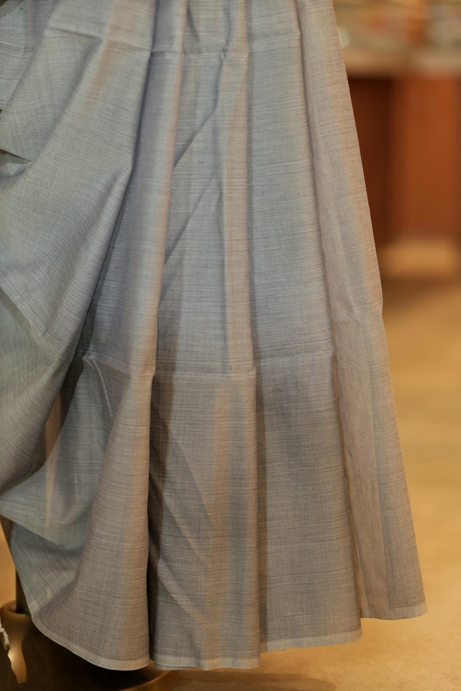A whisper of moonlight woven in threads, The Chandrika Vasini captures the purity of tradition in its calm and graceful form. This handwoven cotton Maheshwari saree, in a gentle misty grey, reflects quiet sophistication - light as air, soft to touch, and effortlessly elegant. Its subtle texture and fluid drape embody the finesse of Maheshwar's weaving legacy, making it perfect for refined everyday wear or graceful occasions.