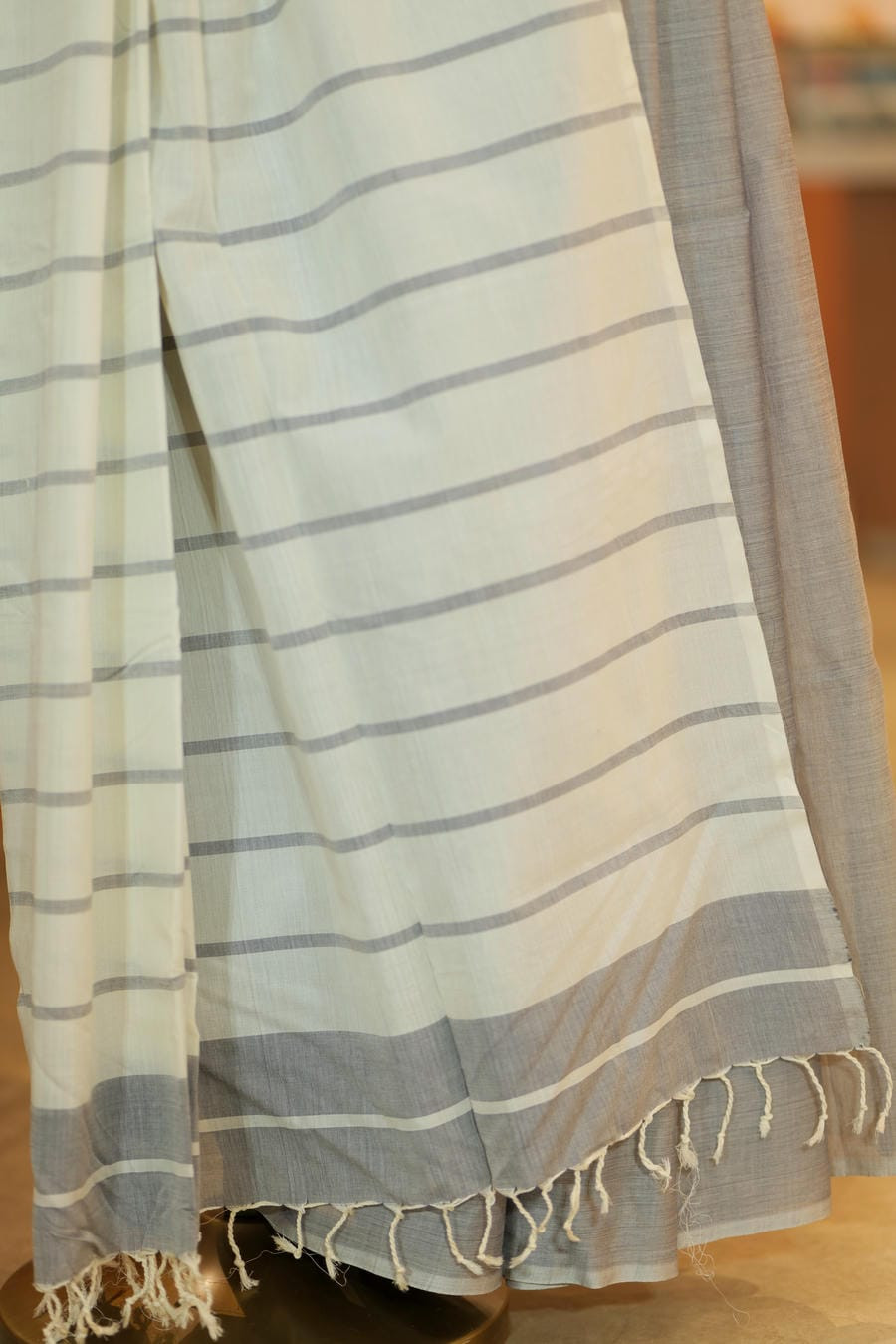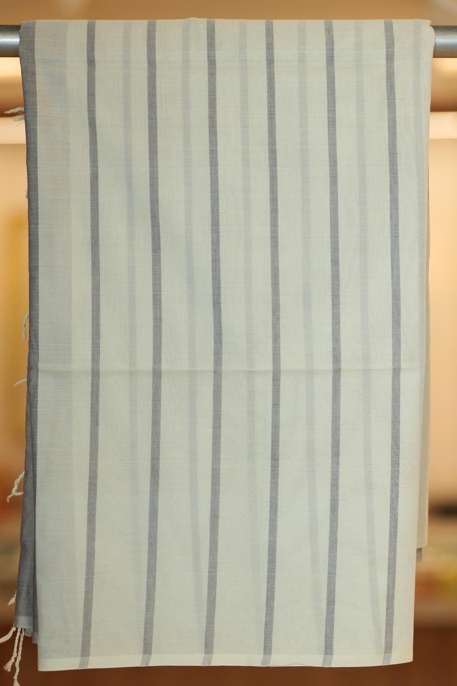 The blouse, in a delicate ivory hue adorned with fine grey stripes, complements the saree with understated charm. The combination of soft tones and intricate weave brings together serenity and style, making this ensemble a timeless expression of elegance.