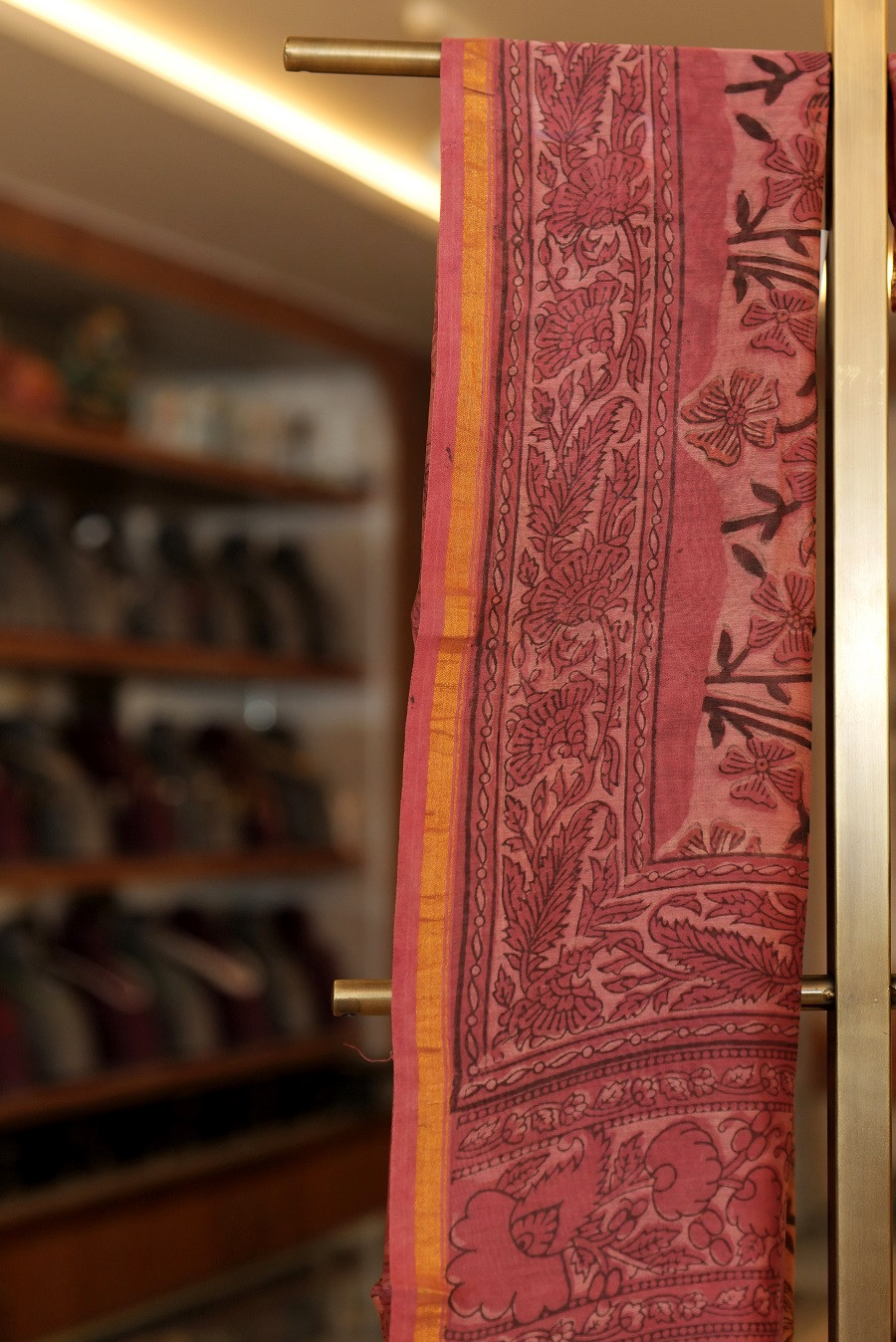 Set on a warm gulabi-pink base, the saree is delicately adorned with fine handblock butis, patiently printed using hand-carved wooden blocks. The borders and pallu unfold with intricate floral and vine motifs, echoing the richness of Rajasthani textile traditions while maintaining a refined, understated charm.