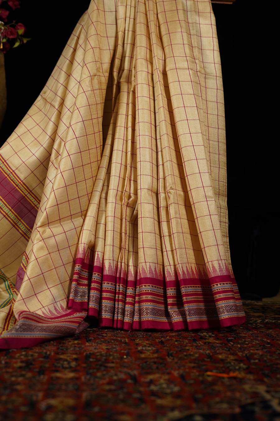 The natural golden-beige body of wild Tussar silk forms the perfect canvas for delicate check patterns, lending rhythm and structure to the drape. Running through it are striking gulabi (rose-pink) rekhās - bold linear bands that bring warmth and vibrance against the earthy base.