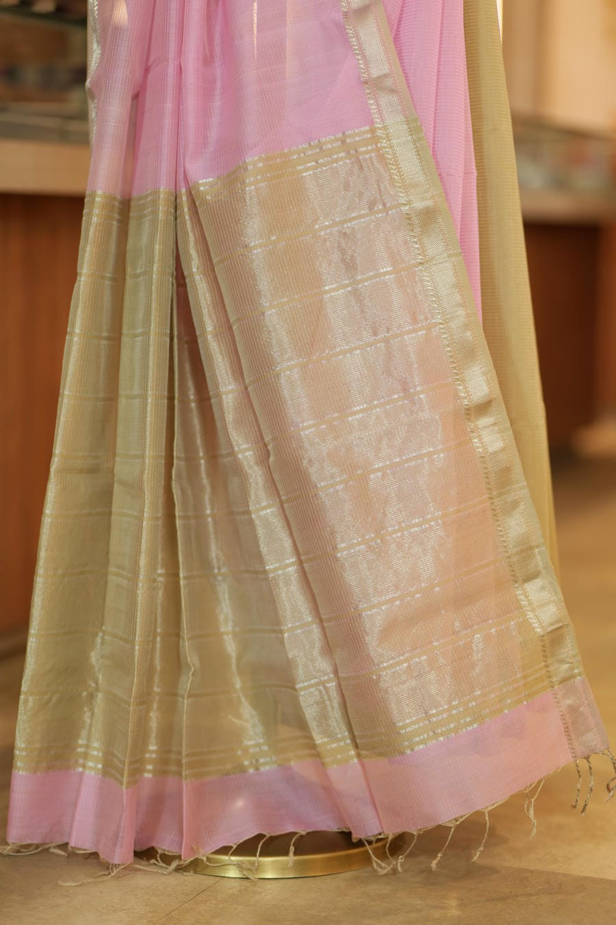 The pallu, crafted in a serene muted-gold shade, carries the signature Maheshwari texture-lightweight, airy, and beautifully translucent. Woven using the traditional tissue Maheshwari weave, the saree blends silk and cotton to create its characteristic crispness, delicate sheen, and intricate zari patterning.