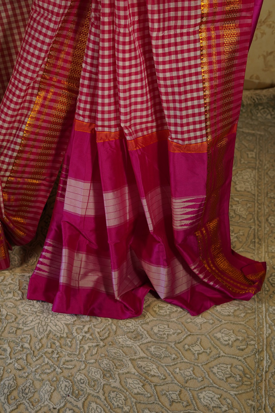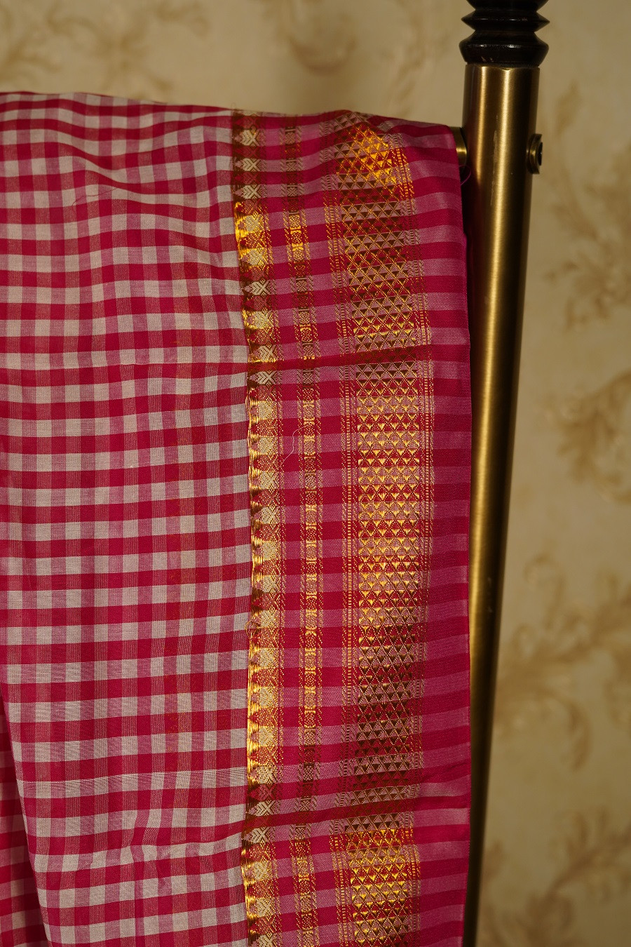 Woven in a breathable cotton silk blend, the saree features a finely detailed pink and ivory micro-checkered body - light, rhythmic, and effortlessly elegant. The vibrant rani pink border and pallu are enriched with traditional zari detailing and temple-inspired motifs, lending ceremonial brilliance to the classic pattern.