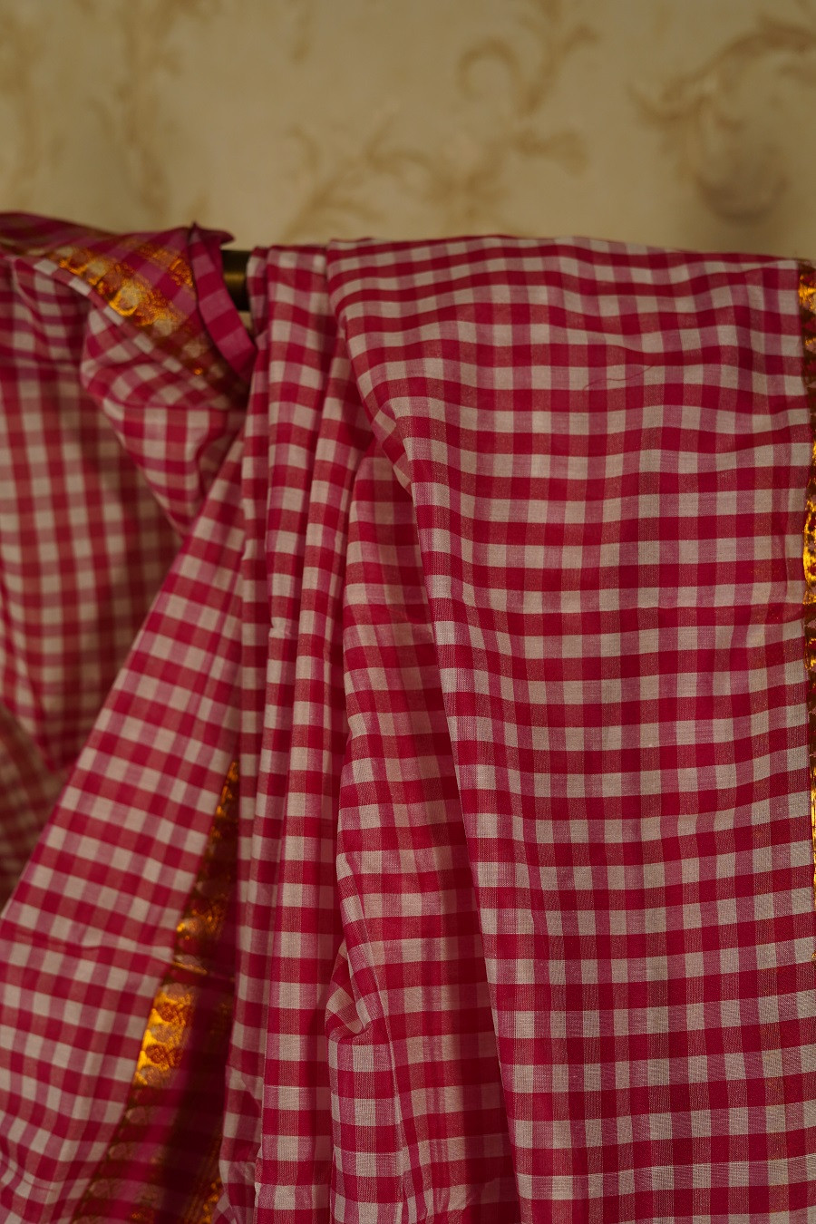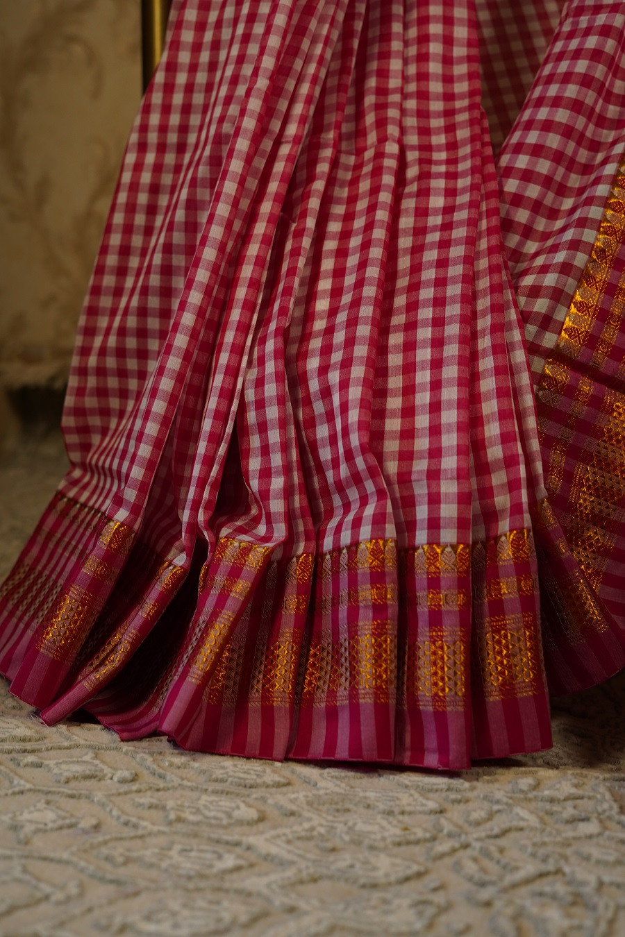 A delicate balance of charm and tradition, The Gulrekha Ilkal is a celebration of timeless checks elevated with festive radiance.