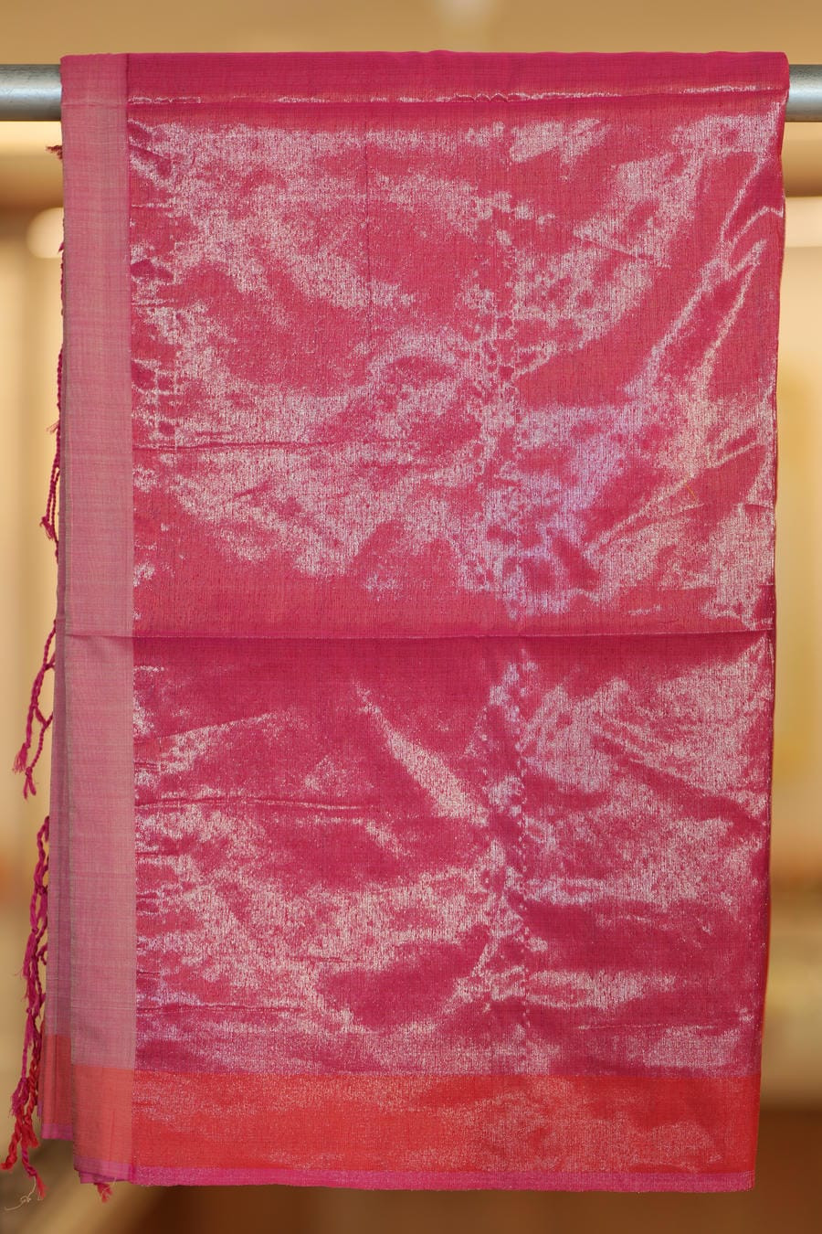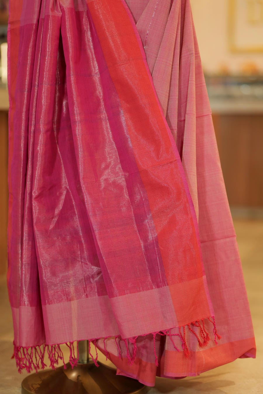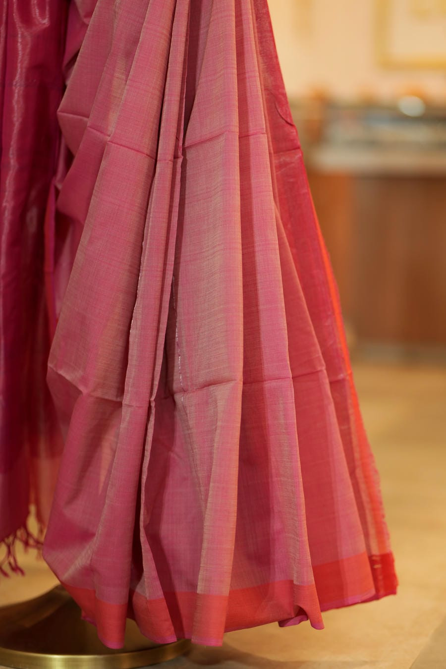 Soft, radiant, and delicately feminine, The Gulzarini is a pure Maheshwari saree that captures the charm of blooming roses and the subtle sheen of traditional handloom art. Its elegant rose-pink body glimmers with a gentle metallic undertone, creating a beautifully fluid play of light as it drapes.