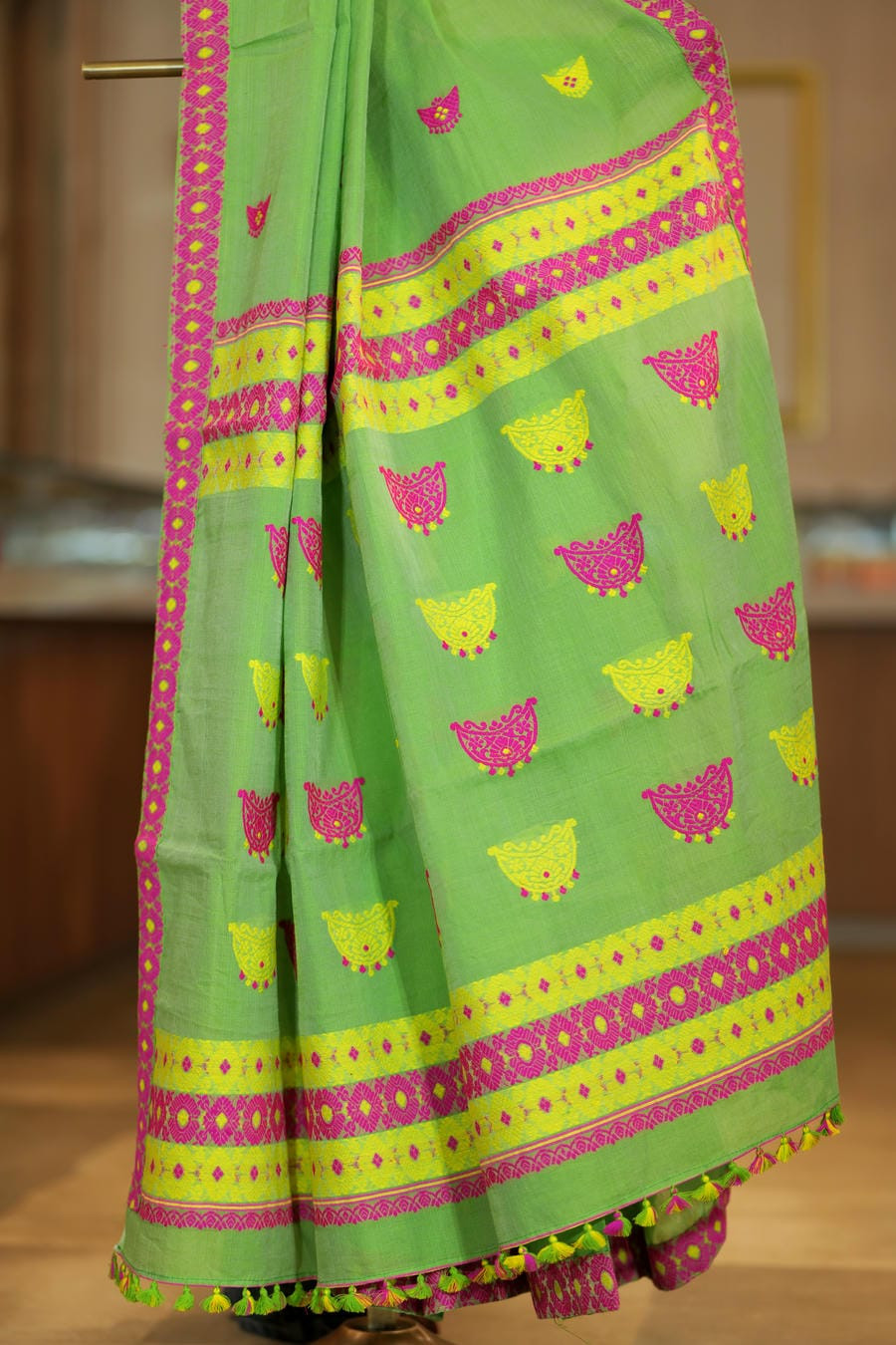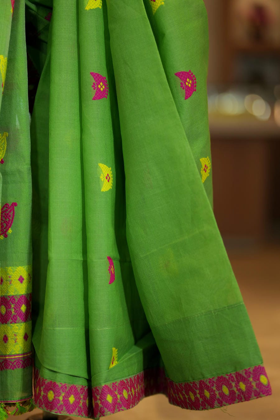 Tiny woven butis are delicately scattered across the saree, adding soft detail to the vibrant base. A contrasting magenta border, enriched with traditional woven motifs, frames the drape beautifully and lends a festive yet balanced charm. The pallu follows the same design rhythm and is finished with hand-tied tassels, reflecting its handloom character.