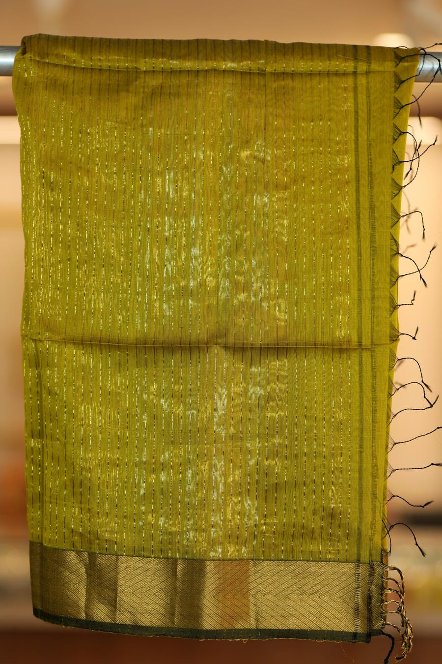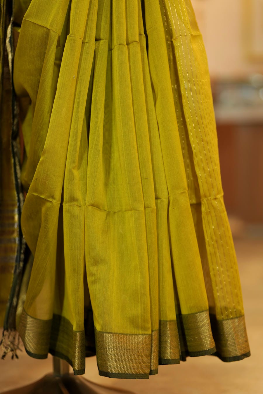 An ode to harmony and heritage, The Hariprabha is a pure Maheshwari saree that captures the resplendence of green and gold — colours long cherished in Indian tradition for prosperity and grace. Handwoven with luminous zari borders and a subtle golden sheen, this saree mirrors the tranquil glow of sunlight filtering through lush canopies. Its featherlight silk-cotton weave drapes with effortless grace, exuding poise and quiet luxury.