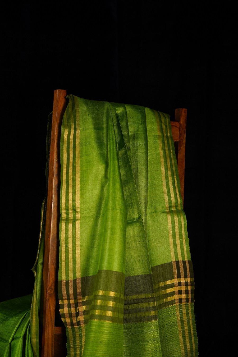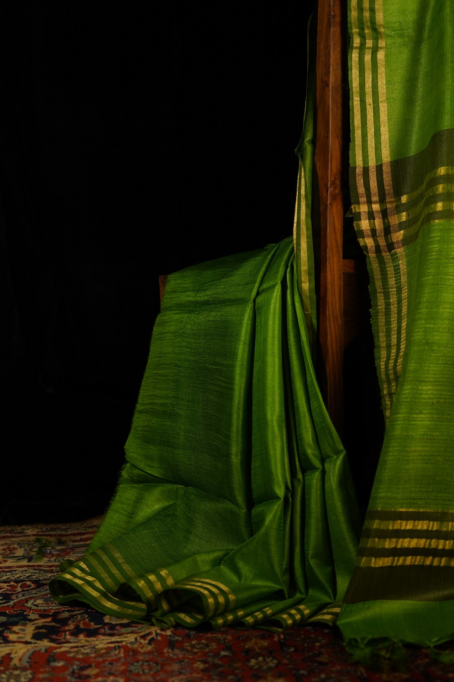 Fresh, grounded, and quietly radiant, The Harit Kosa is woven in pure Tussar (Kosa) Silk, celebrated for its organic texture and soft, natural sheen. The vibrant green hue evokes new leaves and fertile landscapes, carrying a sense of vitality balanced by calm elegance.