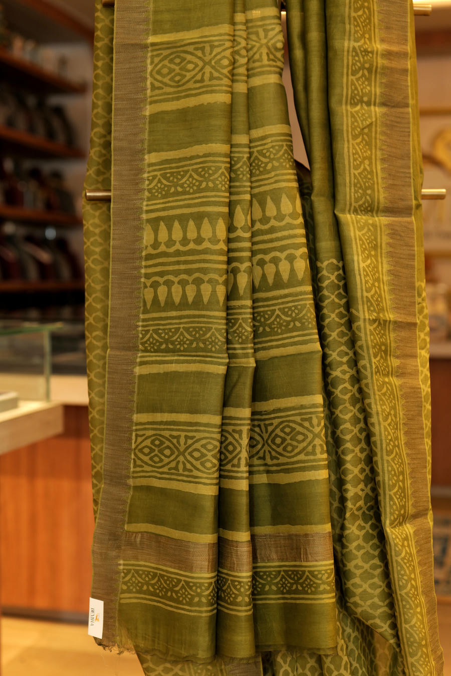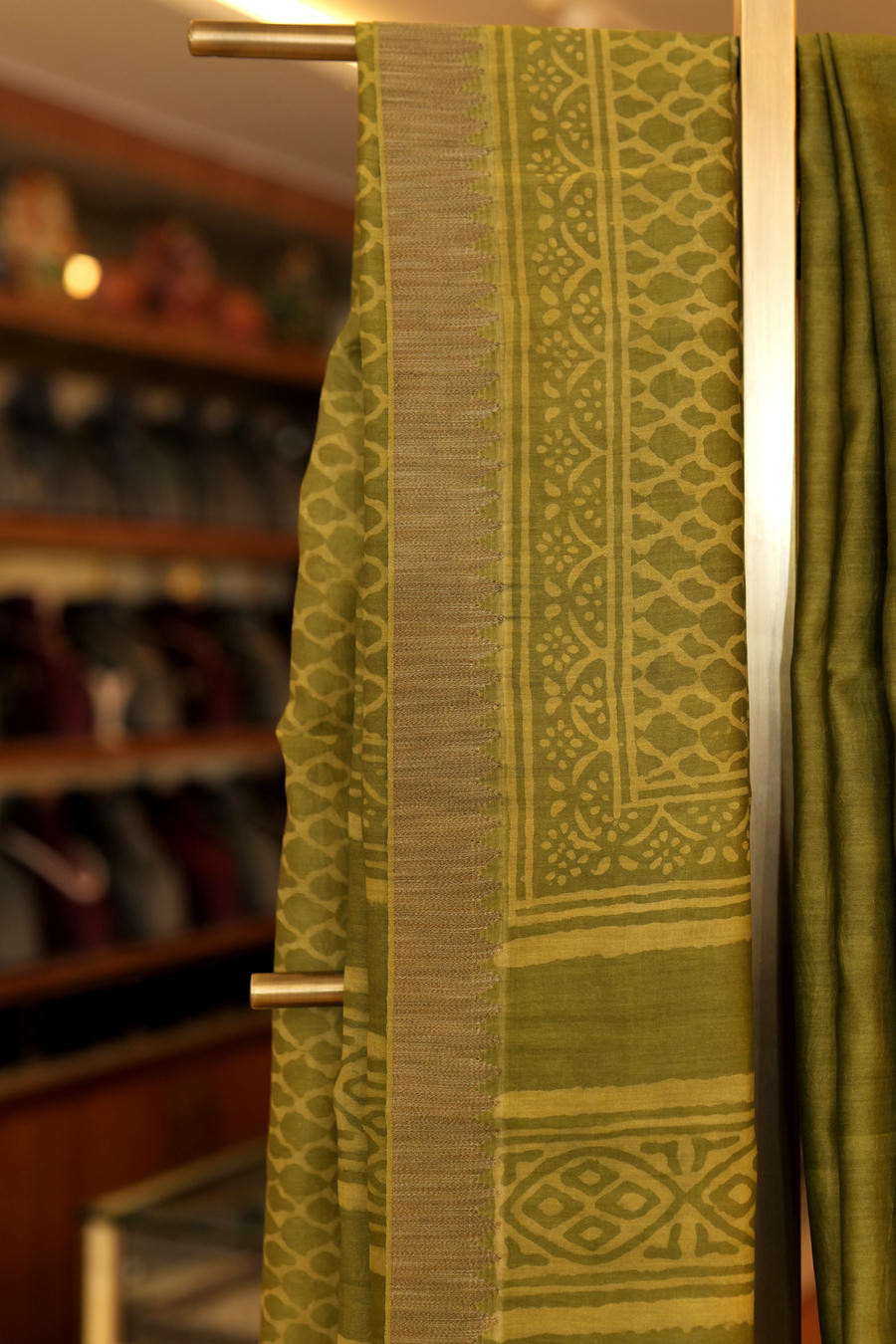 Earthy, rooted, and rich in tradition, Harit Sutra is a classic Bagru handblock print saree that reflects the quiet beauty of nature-inspired craft. Woven in a deep olive-mehendi green base, the saree is adorned with traditional Bagru motifs printed using age-old handblock techniques, lending it a timeless, artisanal character.
