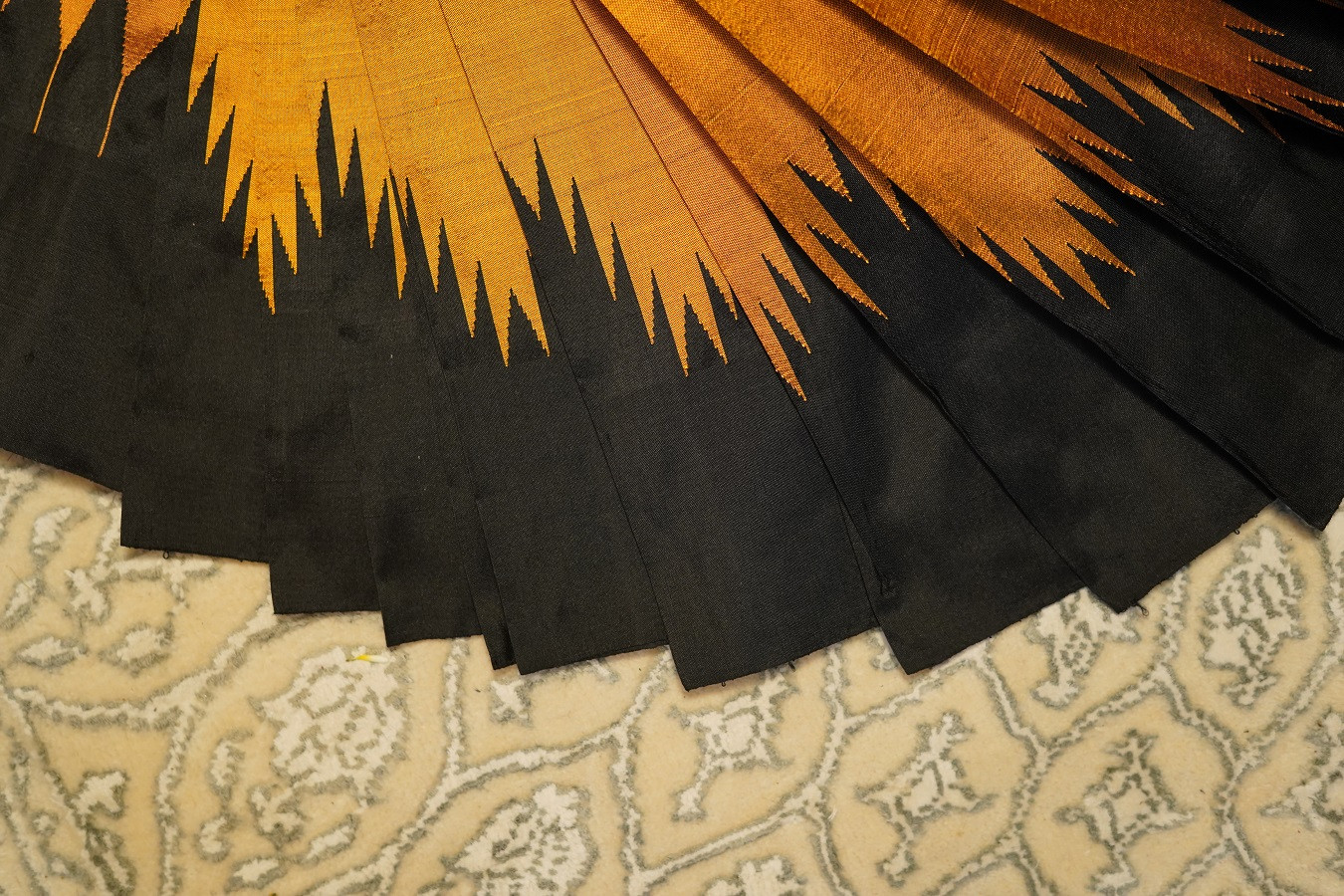 Woven in pure silk, the saree unfolds in a glowing mustard-gold body that captures light with a regal warmth. The striking black border and pallu lend depth and drama, while the rhythmic temple-inspired motifs create a powerful architectural silhouette along the hem. The contrast is bold yet refined — a balance of luminosity and intensity.