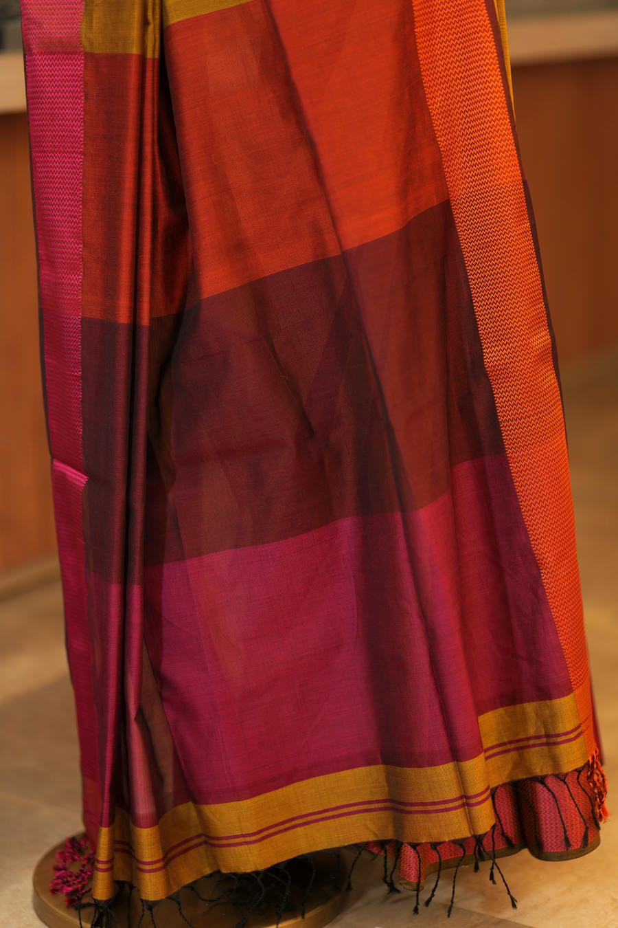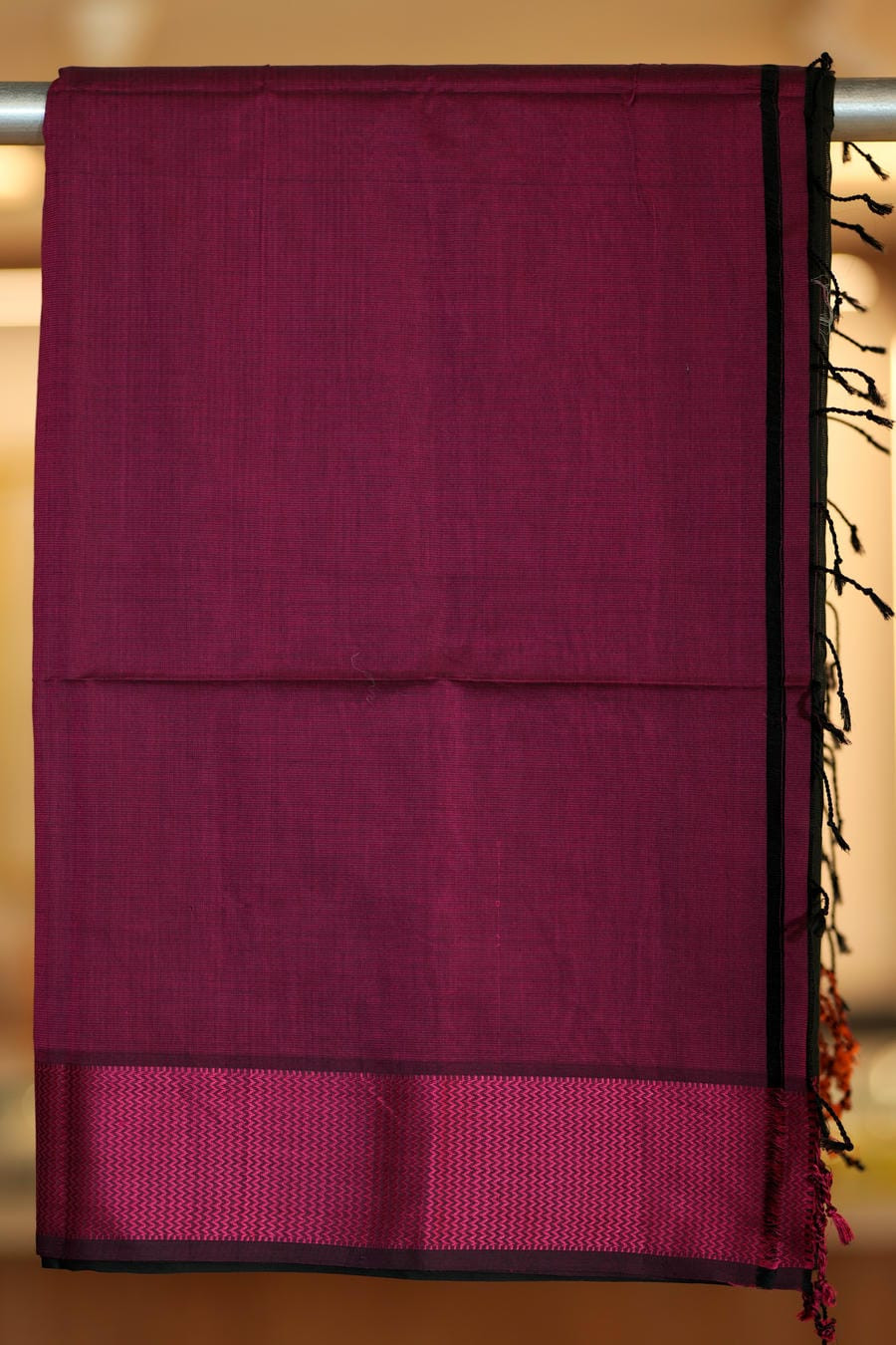 The striking pallu features bold bands of deep maroon, magenta, and rust, blending beautifully to add a festive charm. Subtle zari lines enhance the border, lending a touch of sophistication without overpowering the saree's natural elegance. Lightweight, lustrous, and effortlessly graceful, this saree is perfect for weddings, festive gatherings, temple visits, and elegant evening occasions.