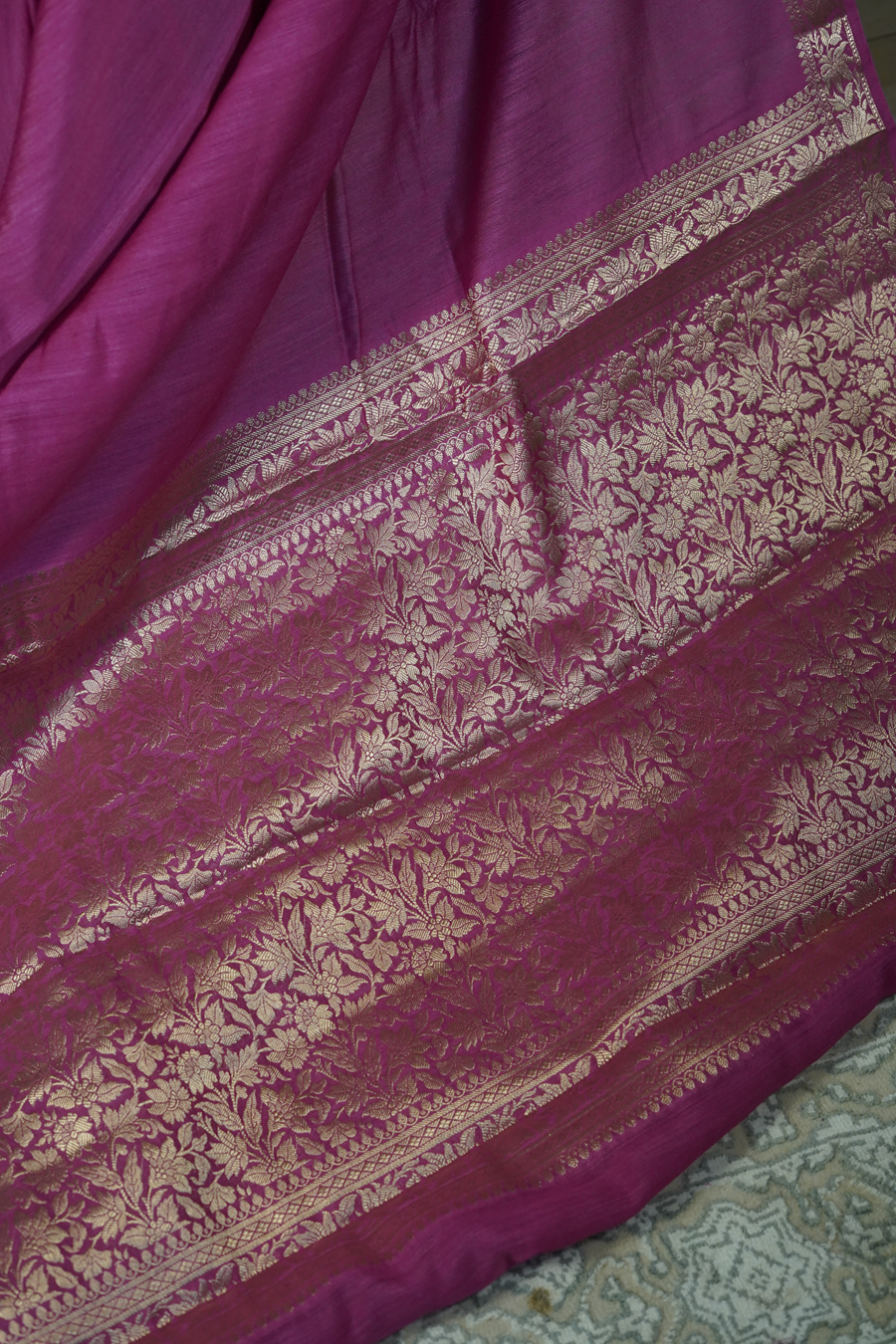 Rooted in the timeless grandeur of Kashi, The Kashi Rani brings together the richness of Banarasi artistry and the fluid elegance of pure Chiniya silk. The vibrant rani pink hue radiates regal warmth, while the finely woven zari border and pallu echo the intricate detailing synonymous with Varanasi's weaving legacy.