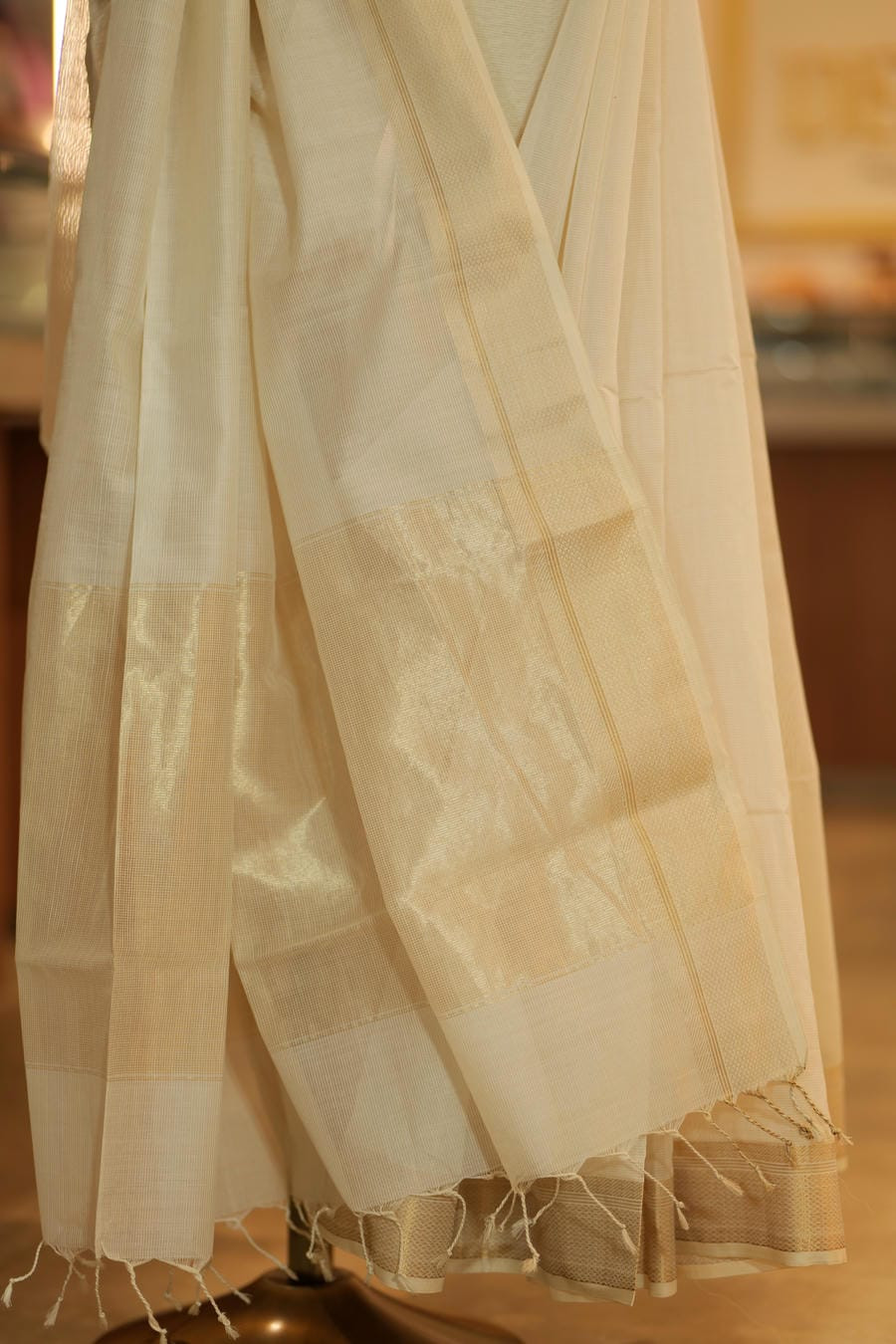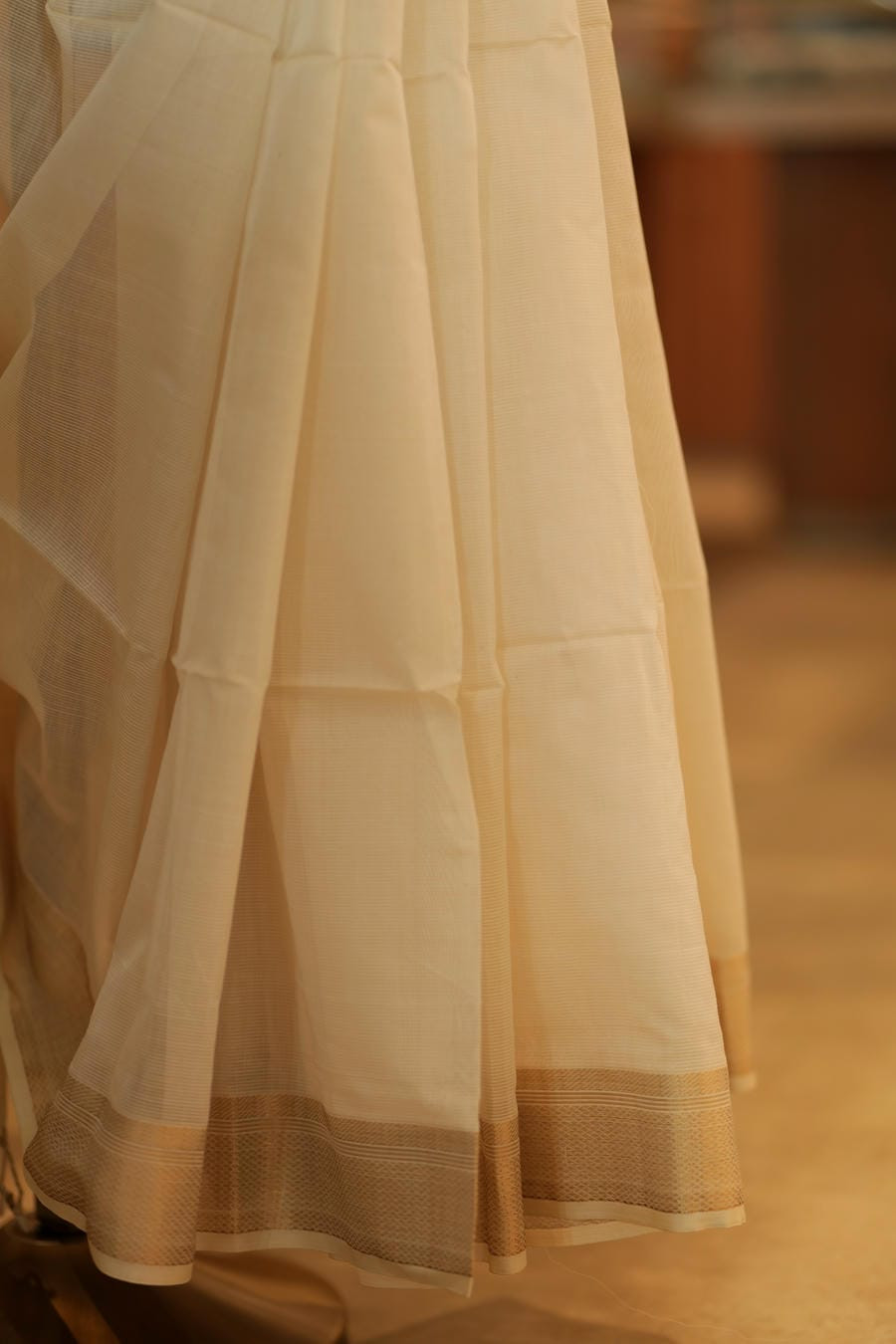 A classic Maheshwari drape where softness meets sophistication, woven for timeless elegance.