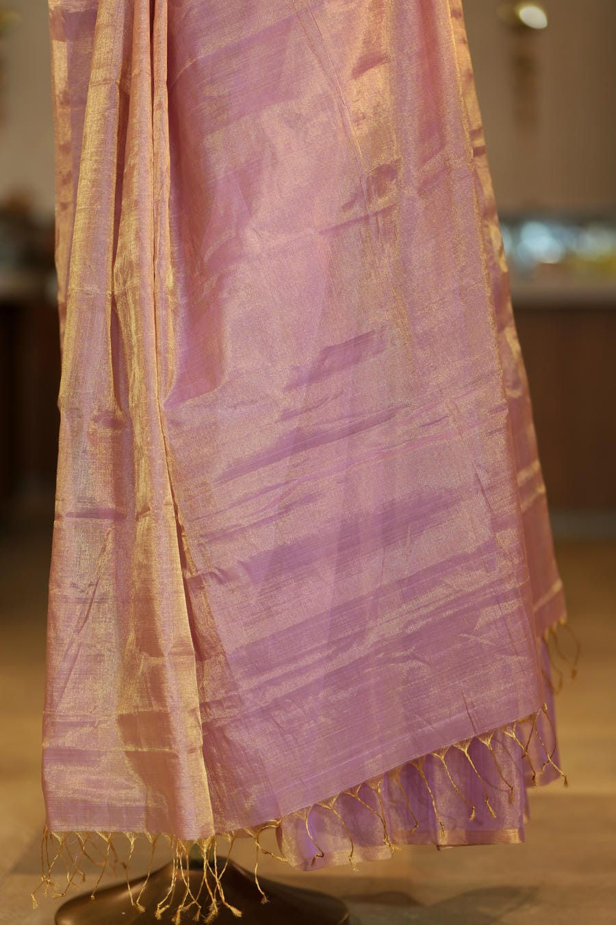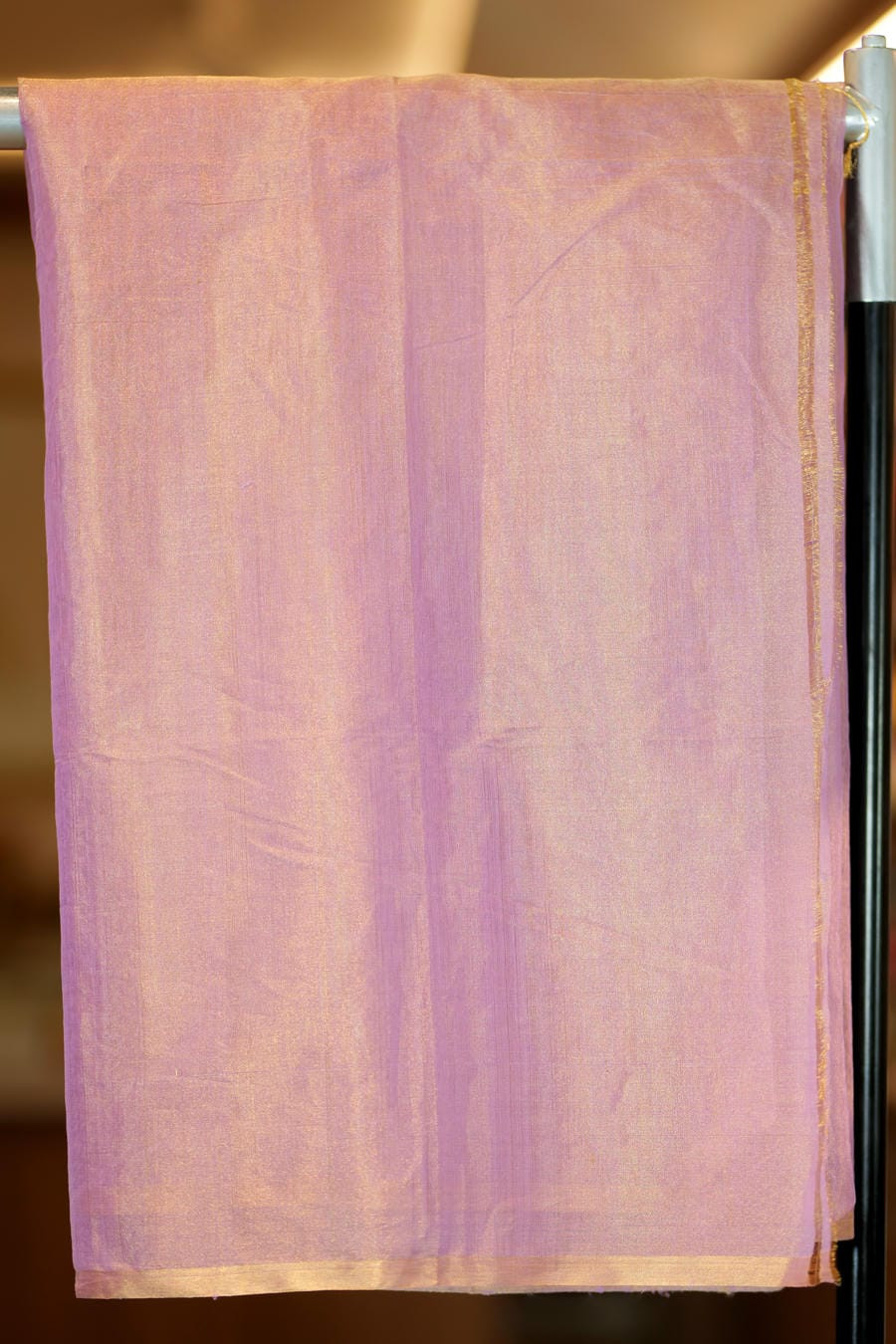 A graceful ode to understated luxury, Lavanya Prabha celebrates the timeless charm of Maheshwari weaving in a delicate tissue texture. Draped in a soft pastel lavender hue with a subtle golden sheen, this saree reflects light beautifully, creating an ethereal glow with every movement.
