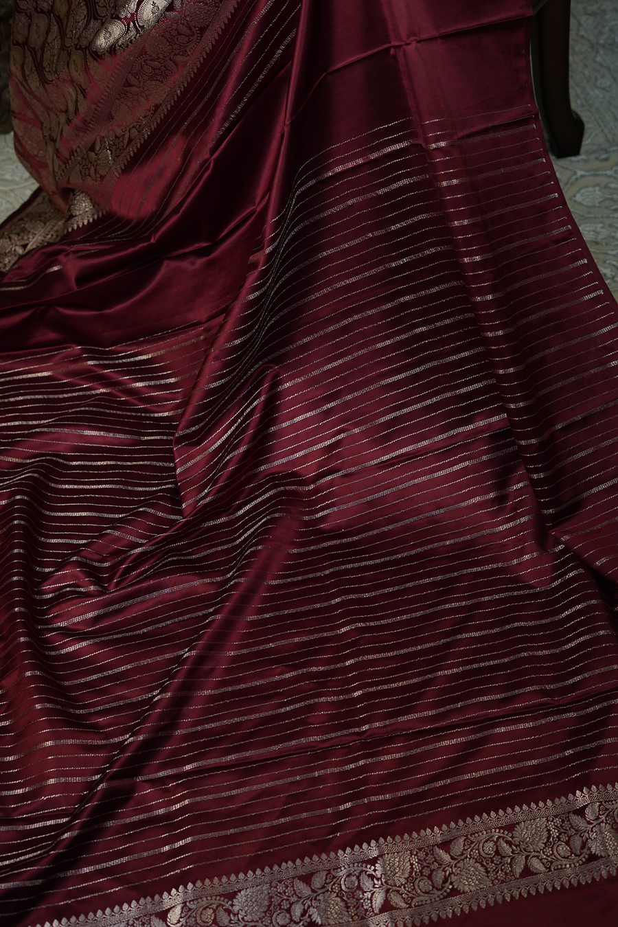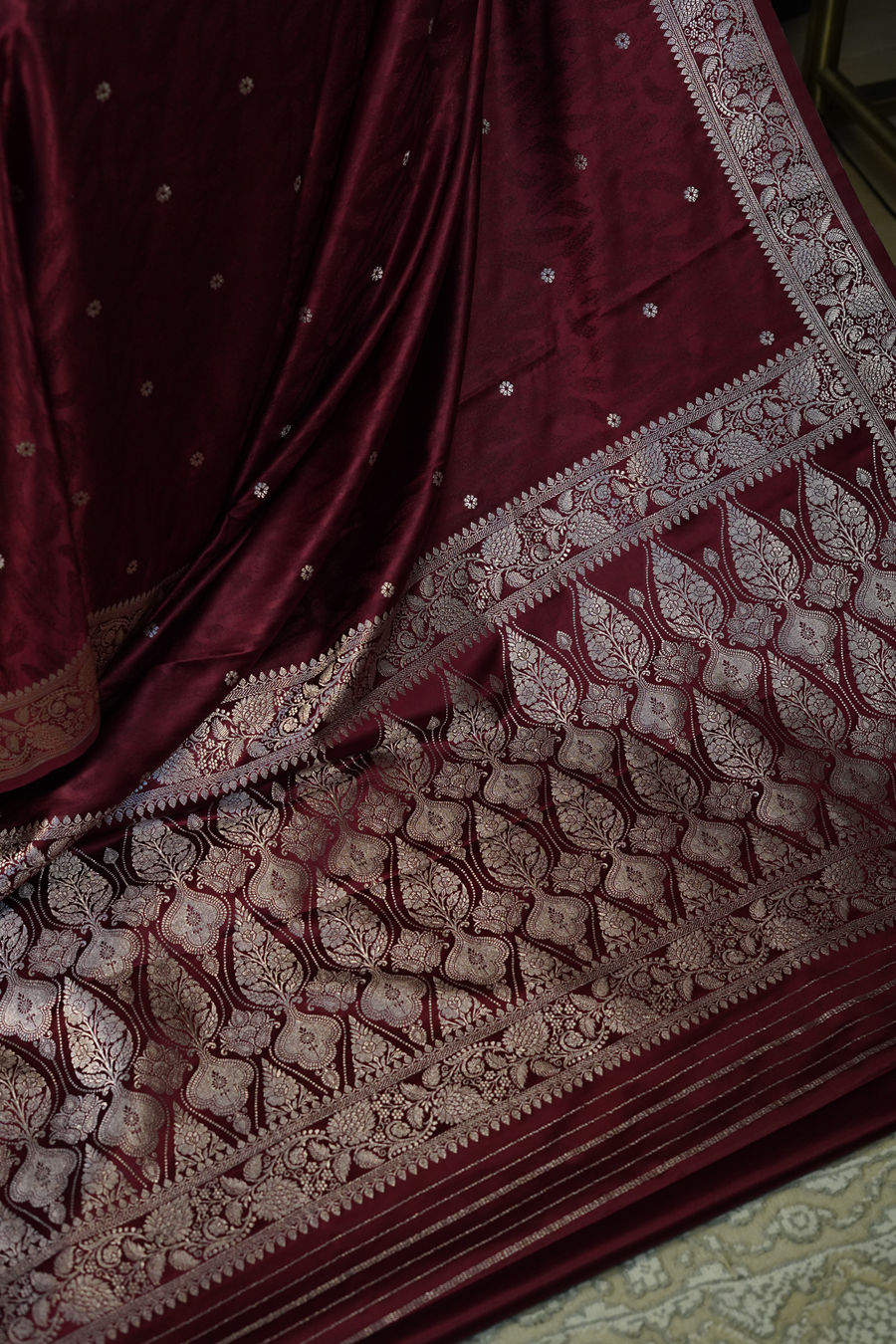 The body features delicate silver zari butis scattered gracefully across the lustrous fabric, adding a refined shimmer. The ornate silver zari border and grand pallu are woven with traditional Banarasi floral and heritage motifs, creating a striking contrast against the rich maroon base.