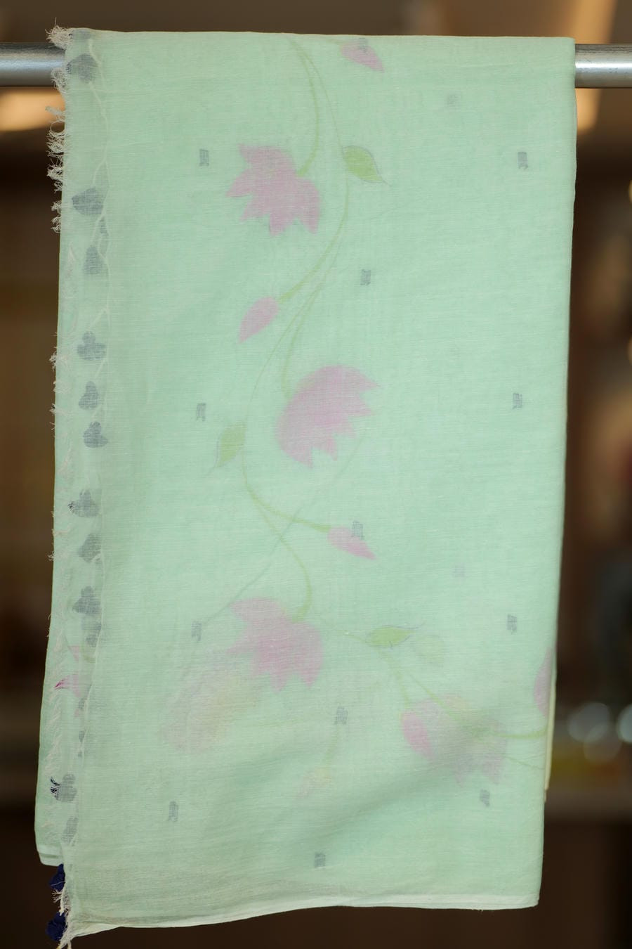 Mint Garden is a hand-painted cotton saree set on a soft mint green base, adorned with delicate floral motifs painted freehand along the drape. The artwork appears light and fluid, with gentle lines that keep the overall look fresh and understated.
