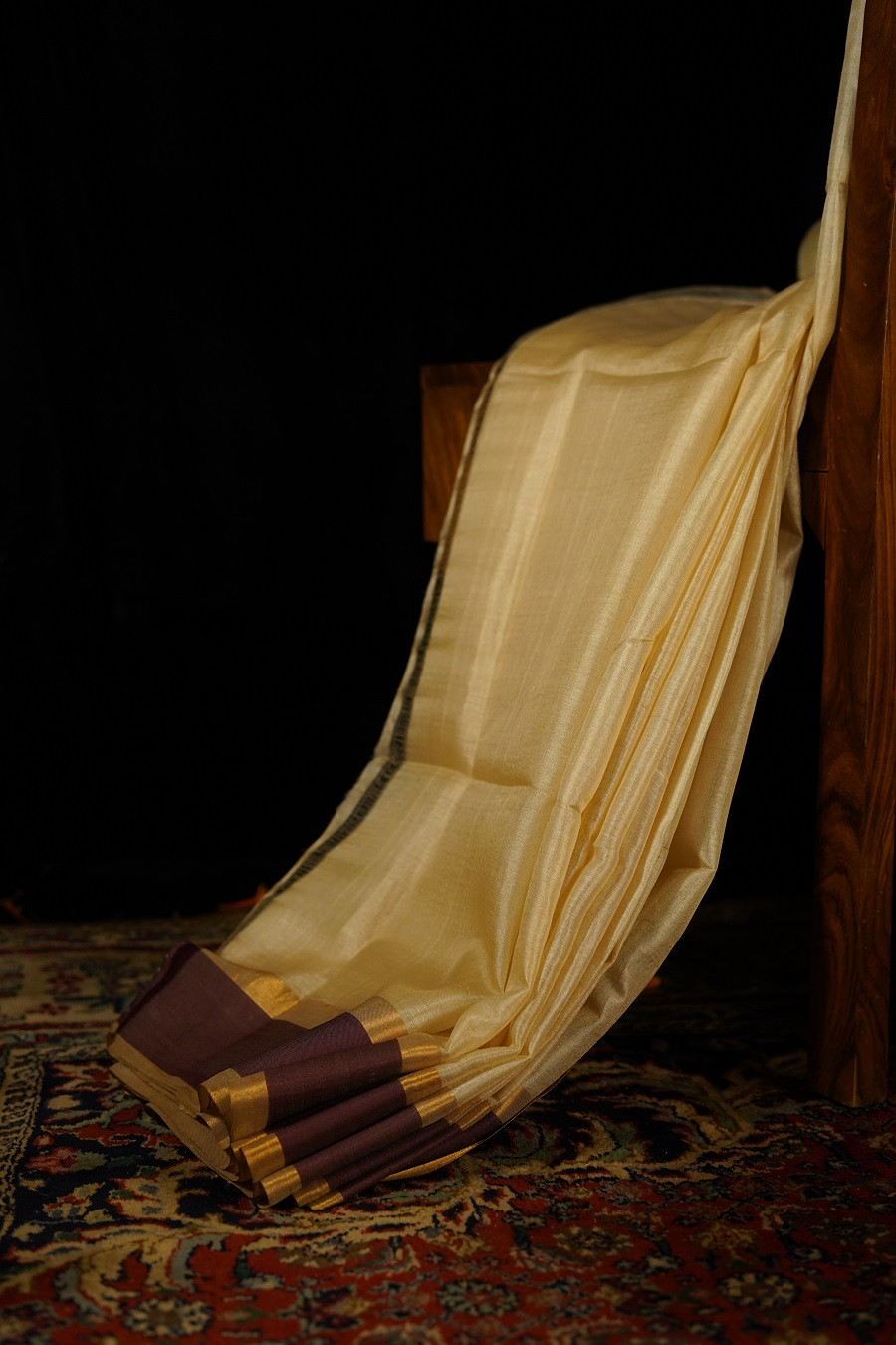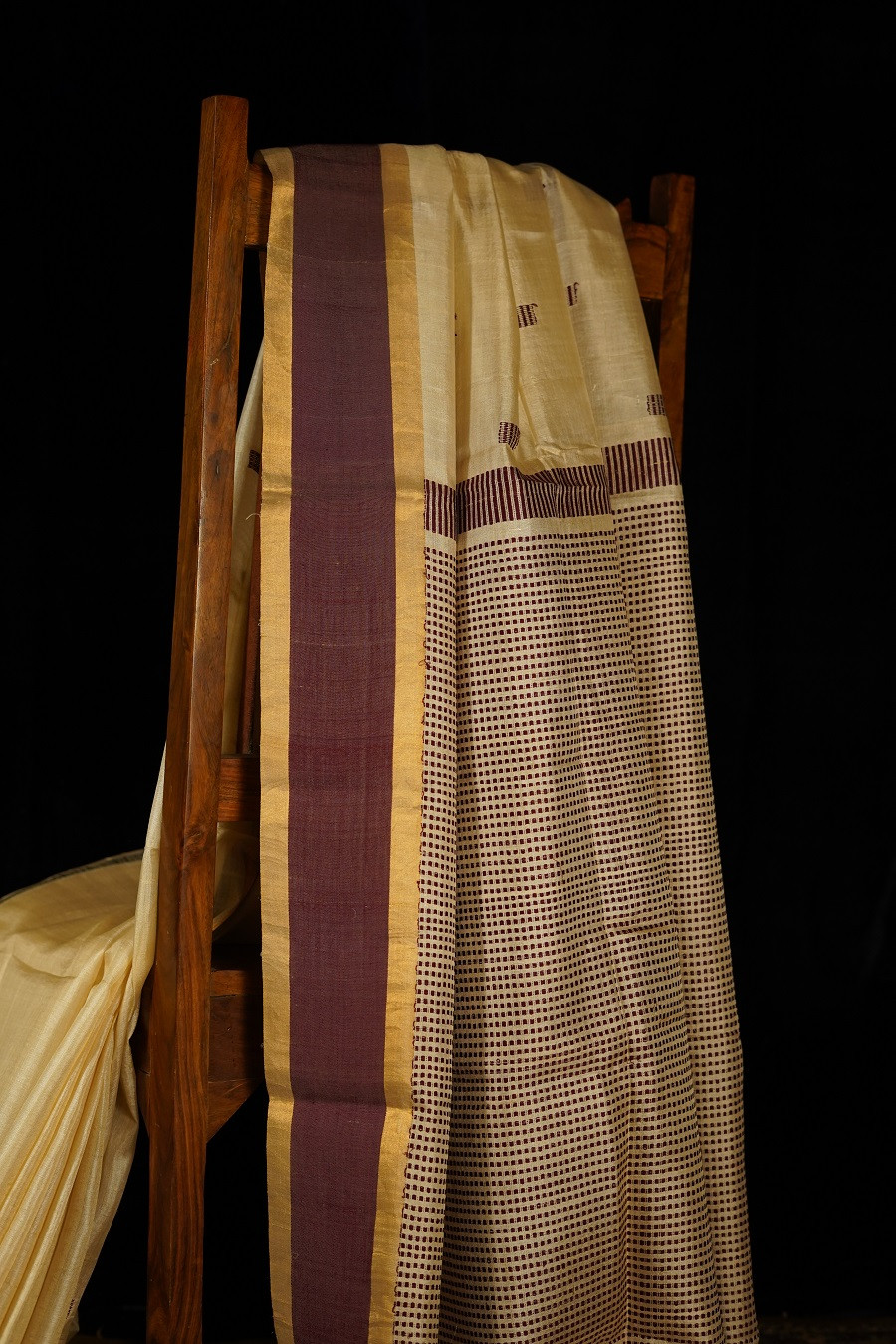 Timeless and graceful, The Muga Kosa is woven in pure Handloom Muga Silk, celebrated for its natural golden undertone and exceptional strength. The soft cream body carries a gentle warmth, beautifully complemented by a deep maroon border that adds depth and classic contrast.