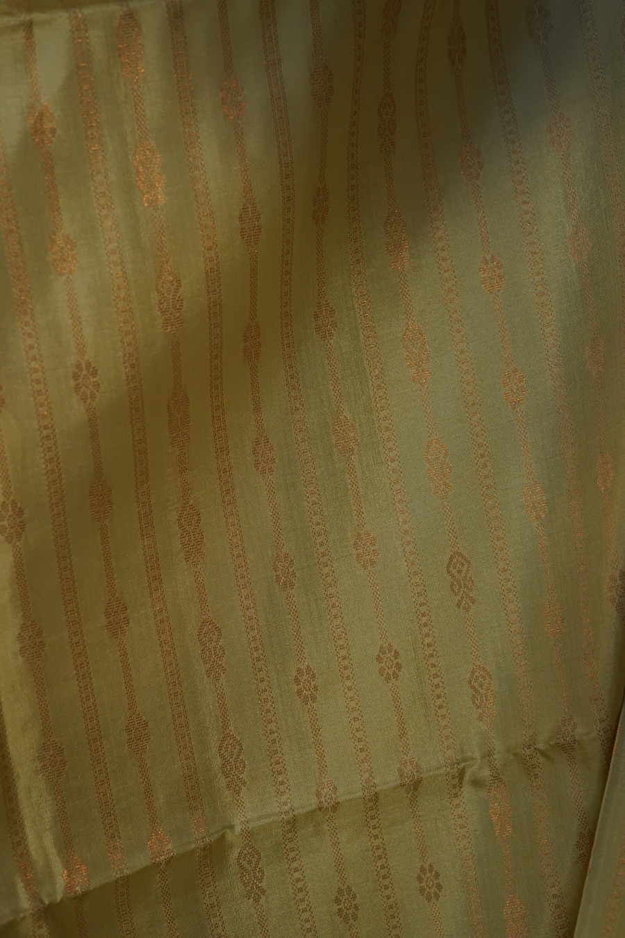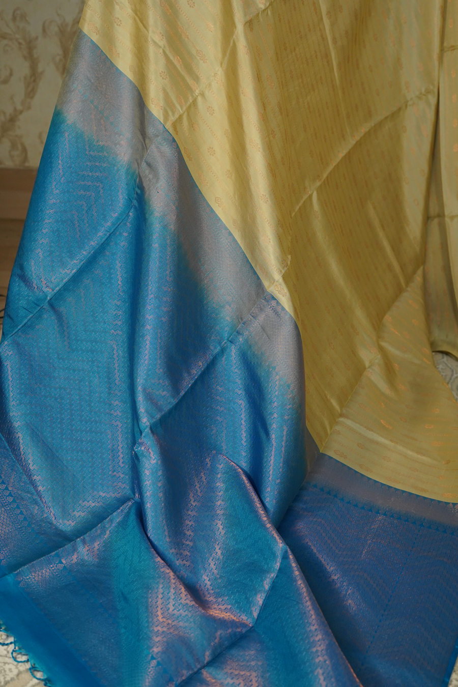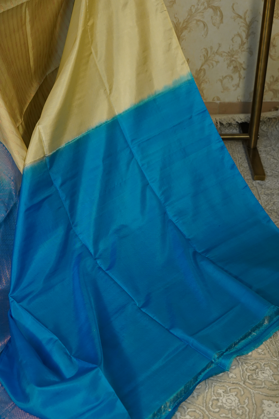 The saree features a luminous cream-gold body, delicately woven with subtle zari motifs that add a gentle shimmer to its elegant canvas. The refined detailing enhances the silk's natural sheen while maintaining an understated, graceful presence.