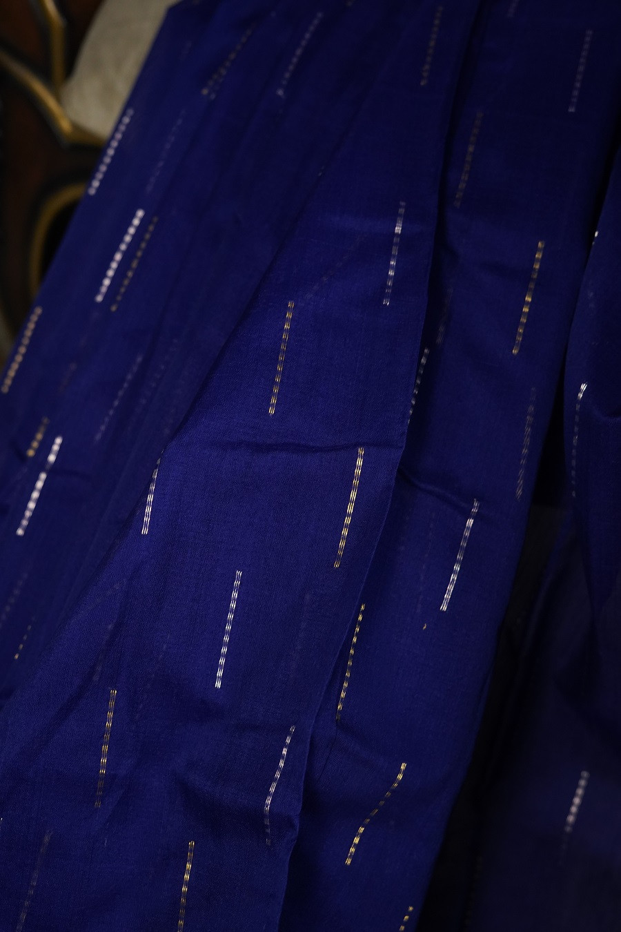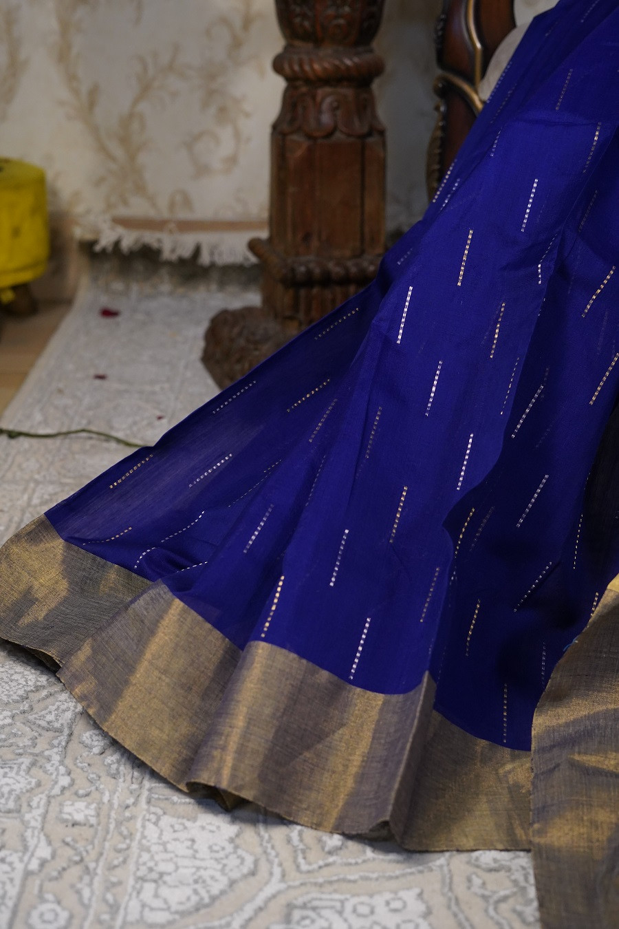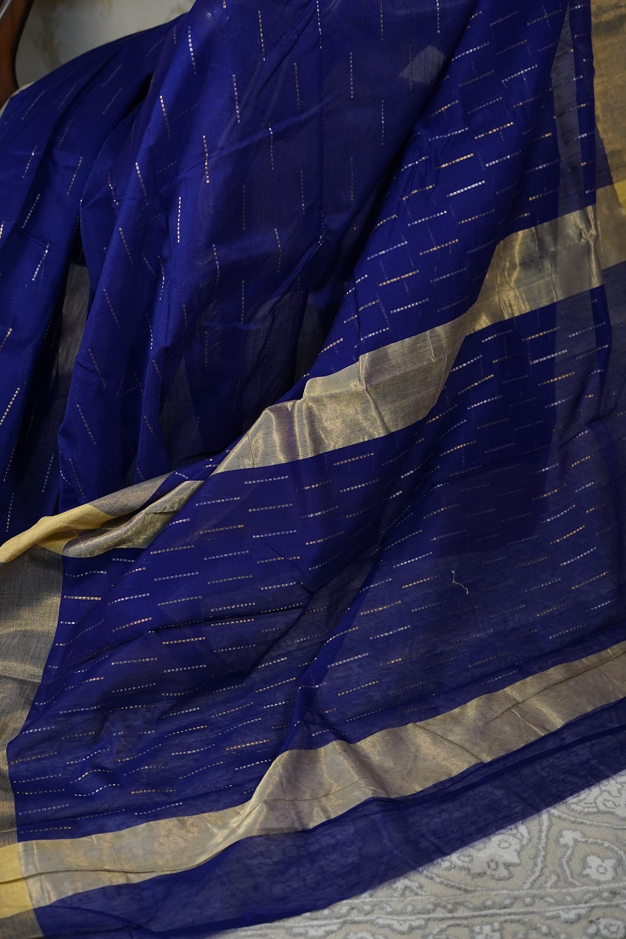 Neel Kargha draws its name from the loom itself-kargha, where threads are patiently brought to life by skilled hands. Woven in handloom Chanderi, this deep blue saree carries the quiet rhythm of traditional weaving, where every line and shimmer is a result of human touch, not machinery.