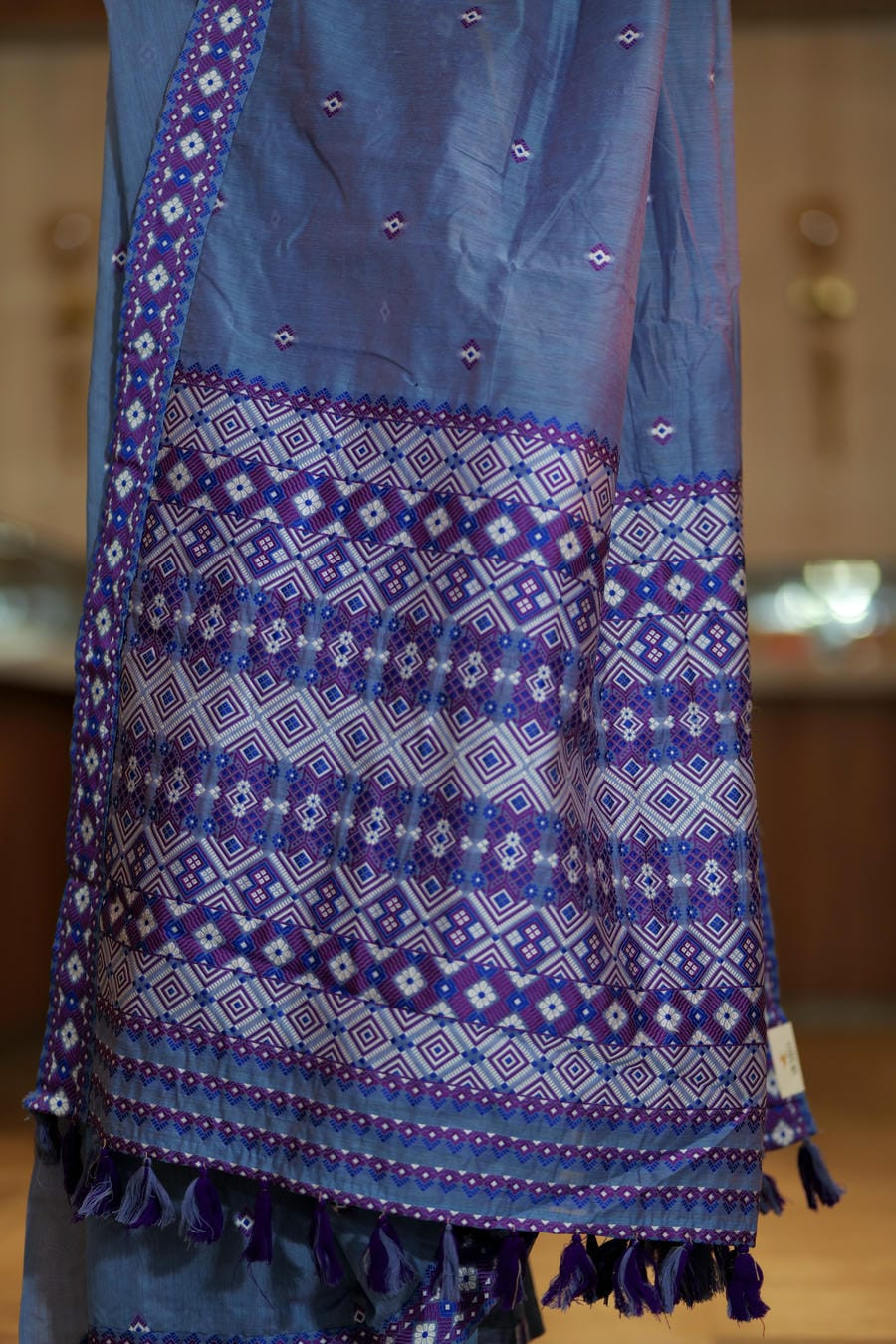 Delicate woven butis are scattered across the fabric, adding gentle detail, while the richly patterned border and pallu feature traditional geometric motifs in deeper blue and ivory tones. Hand-finished tassels complete the pallu, highlighting the saree's artisanal character.