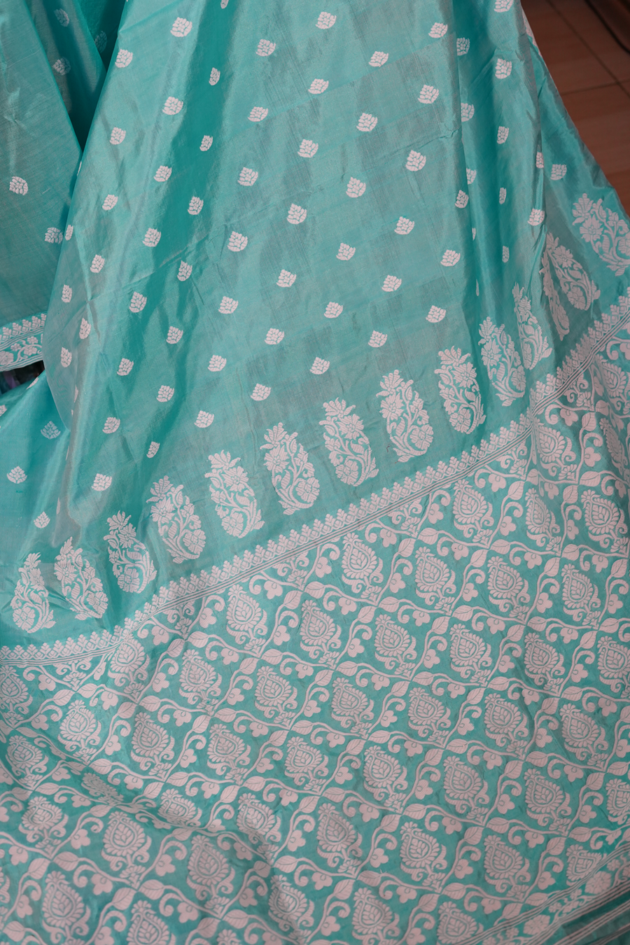 The border lace is attached separately, offering a distinctive layered finish while maintaining the integrity of the silk weave.