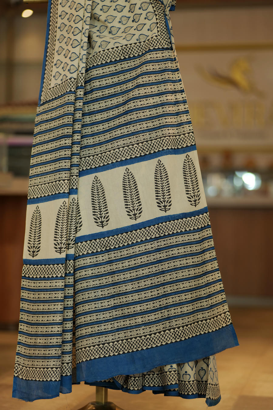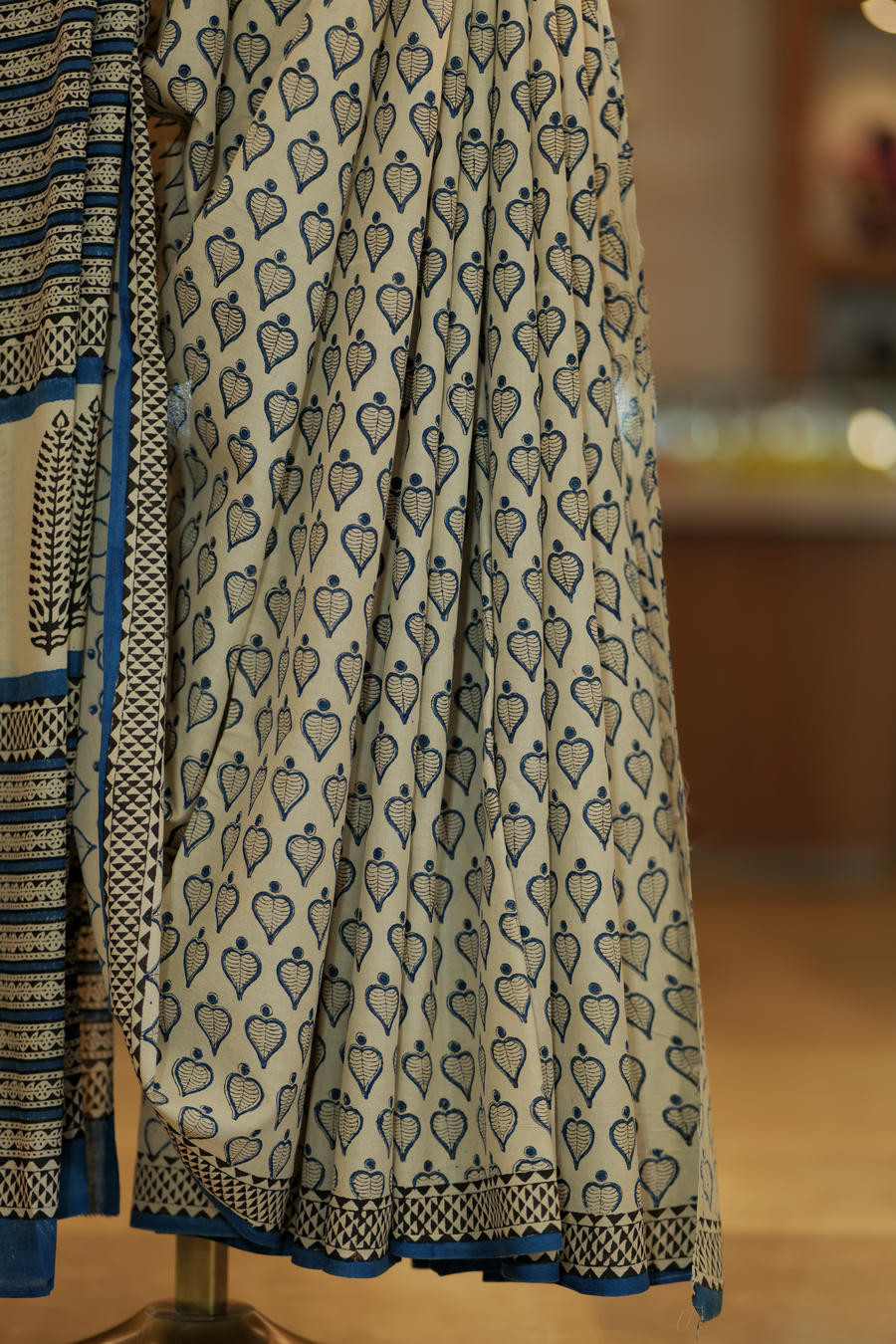 Graceful and refreshing, Neela Pushpa is a pure mul cotton Sanganeri saree that captures the quiet charm of hand-blocked florals. Delicate leaf and bud motifs flow evenly across the body in soothing shades of indigo blue, creating a pattern that feels light, rhythmic, and timeless.