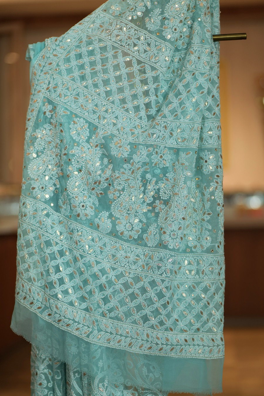 Work: Hand-embroidered Lucknowi Chikankari with refined Gota Patti accents