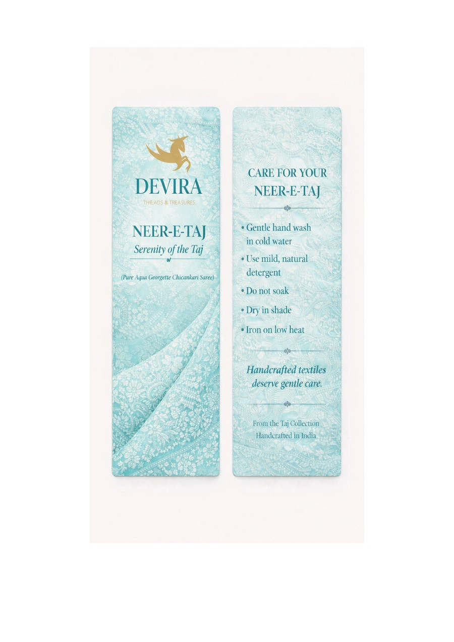 Serene, luminous, and exquisitely regal, The Neer-e-Taj is an ode to fluid elegance—where water-like grace meets imperial craft. Rendered in a tranquil aqua hue, the saree evokes the calm of palace fountains and moonlit courtyards, embodying a refined luxury that is both soothing and resplendent.