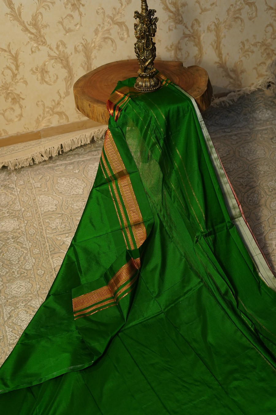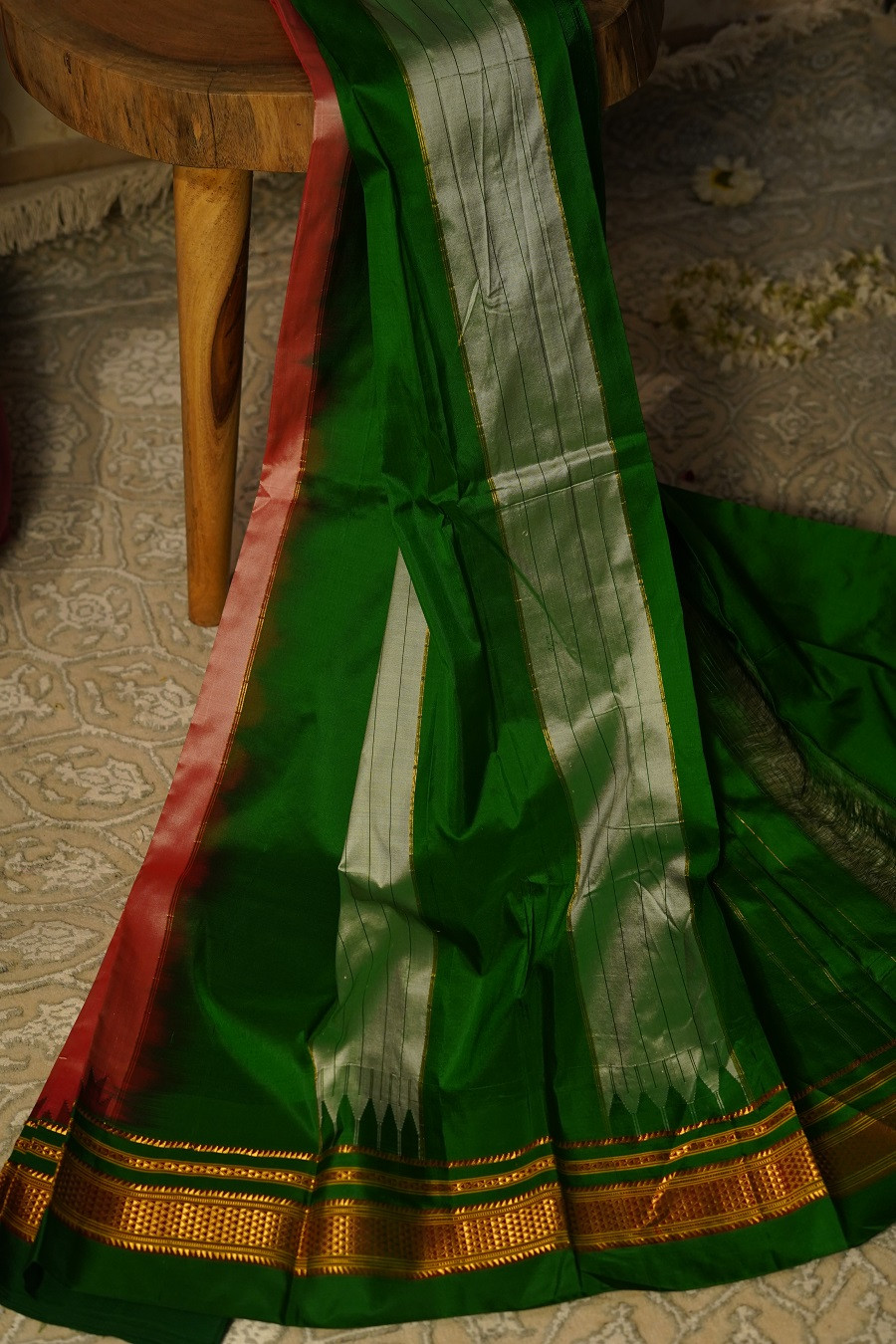 • Emerald-green border & pallu with zari accents