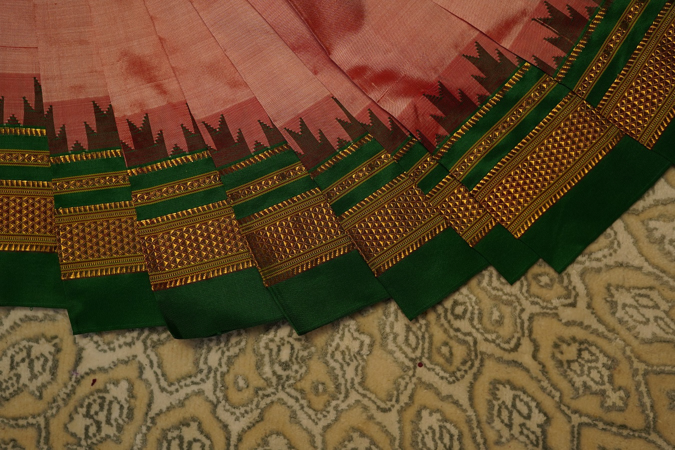 The interplay of warm rose hues and deep green evokes festive splendour - perfect for weddings, auspicious ceremonies, and heirloom celebrations.