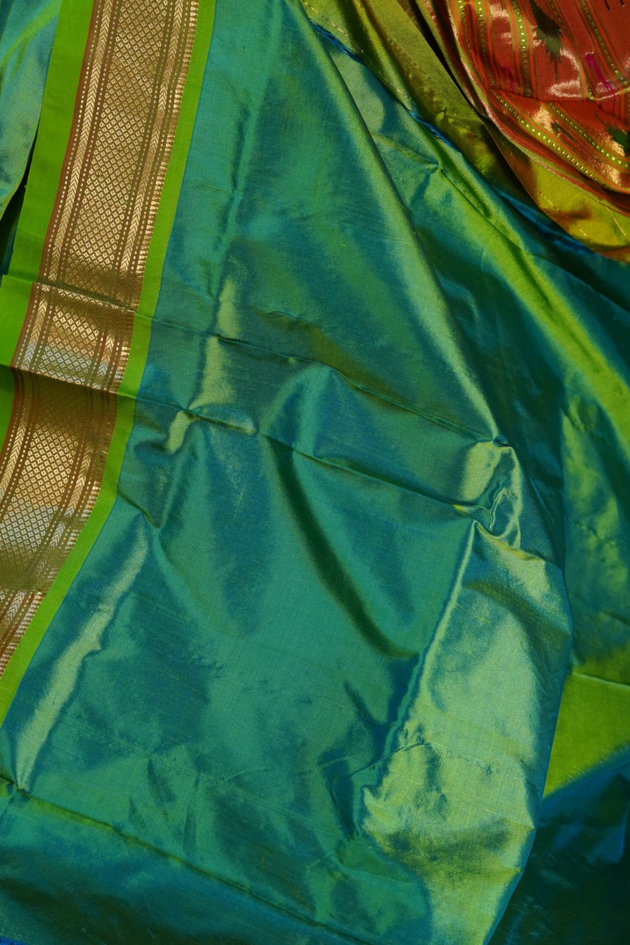 A magnificent harmony of Panna (emerald) and Kesari (saffron), The Pannakesari Paithani is a regal celebration of colour and craftsmanship. This pure silk handloom masterpiece reflects the grandeur of Maharashtra's most treasured weaving tradition.