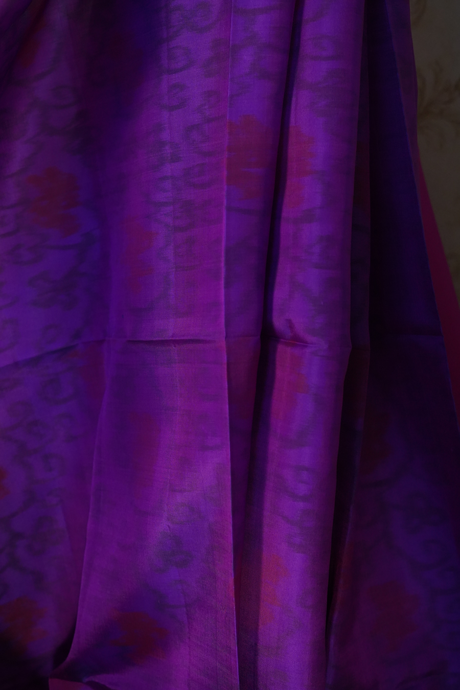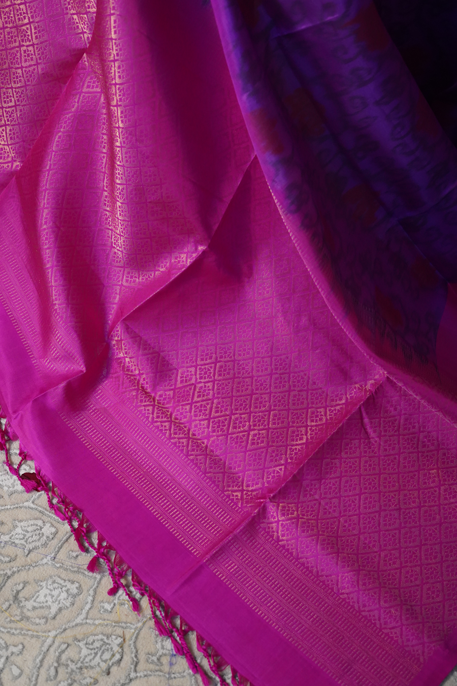 The saree features a rich royal purple body, adorned with intricate Patola-inspired prints that create rhythmic symmetry and cultural depth. The detailed geometric and traditional patterns lend the saree a handcrafted aesthetic while allowing the silk's natural sheen to shine through.