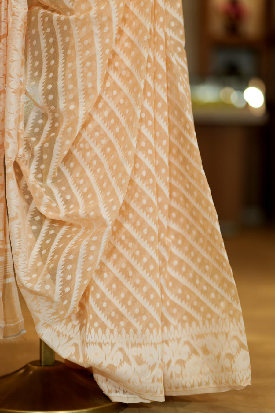 Softly luminous and delicately composed, The Prabha Sandesh is a pure cotton Kolkata saree that celebrates light in its gentlest form. Woven in a serene off-white ivory tone, the saree carries a quiet glow-subtle, balanced, and timeless.