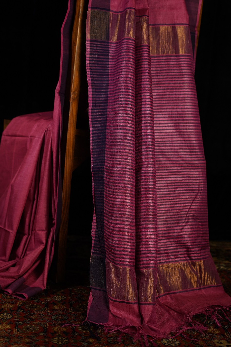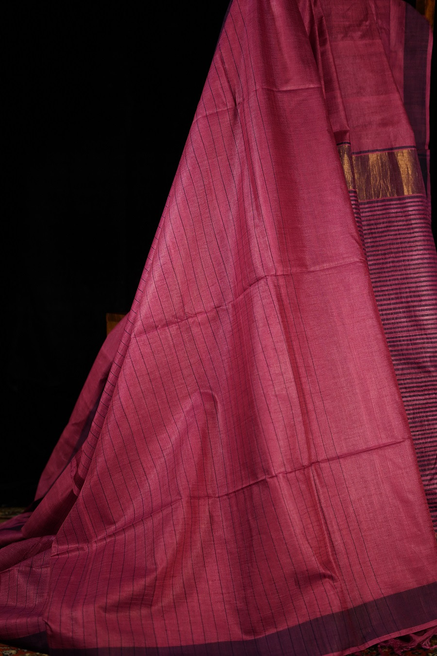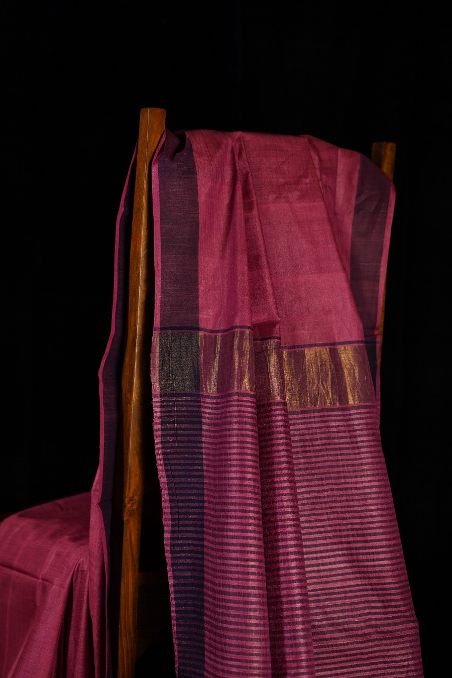 Deep, resonant, and quietly expressive, The Raga Kosa is woven in pure Tussar (Kosa) Silk, admired for its organic texture and soft, natural sheen. The rich wine-magenta hue carries a soulful depth, unfolding beautifully across the body and pallu.