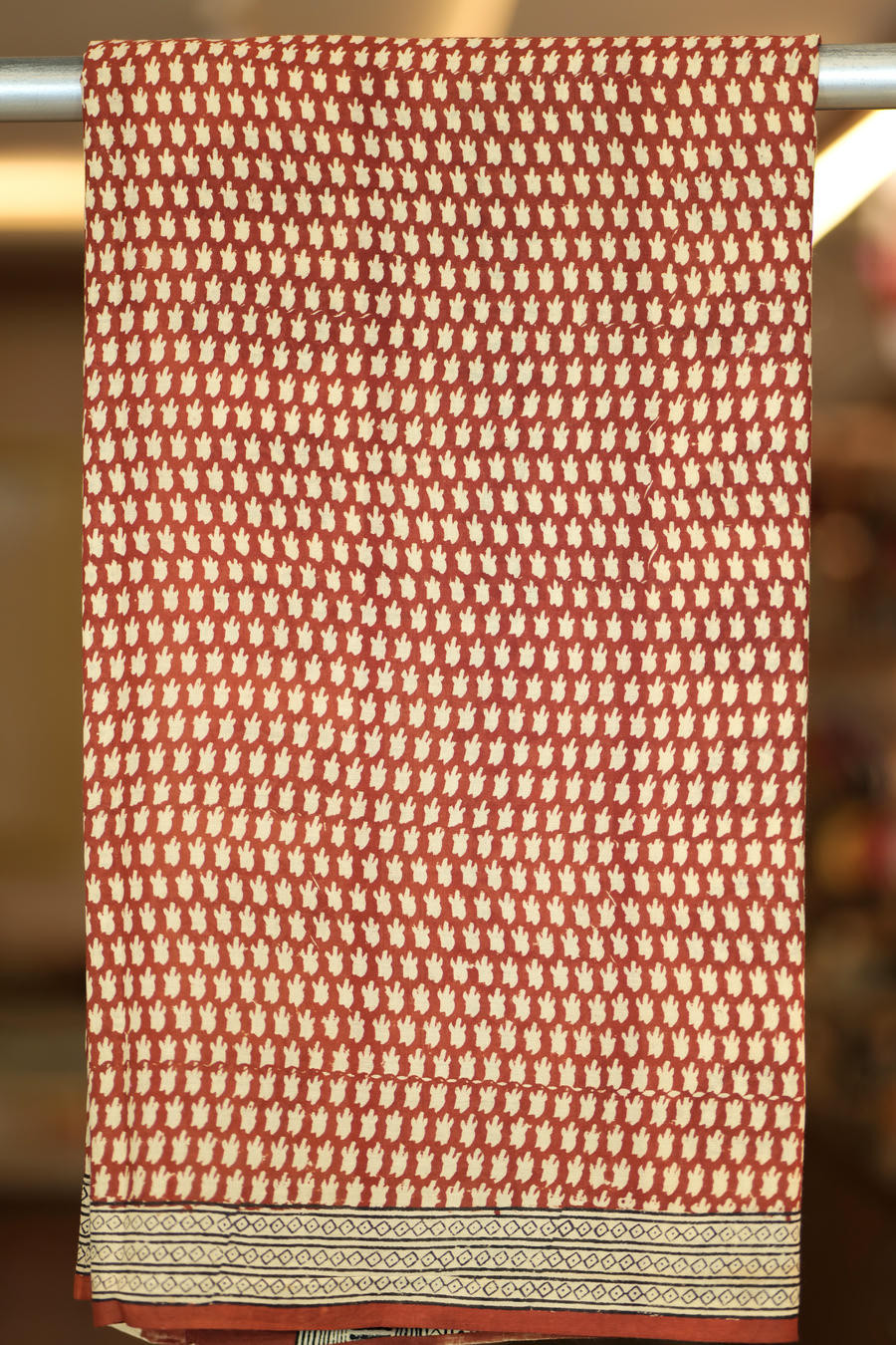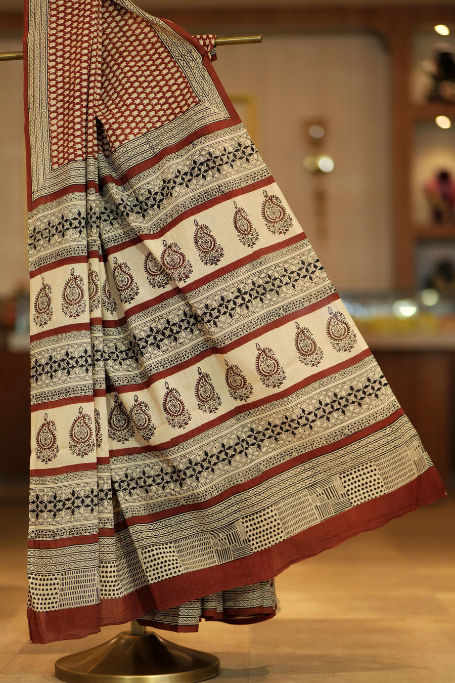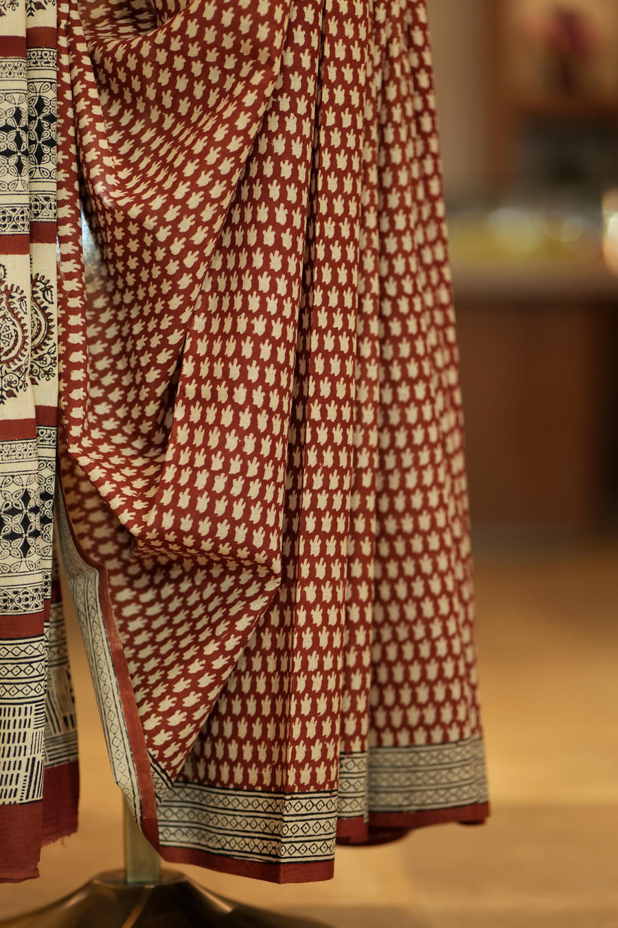 The deep red base is enriched with contrasting ivory and black detailing along the borders and pallu, where intricate paisley and geometric elements reflect the finesse of Sanganeri craftsmanship. Crafted in soft, breathable mul cotton, the saree drapes effortlessly, offering ease alongside artisanal elegance.