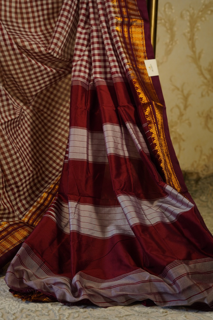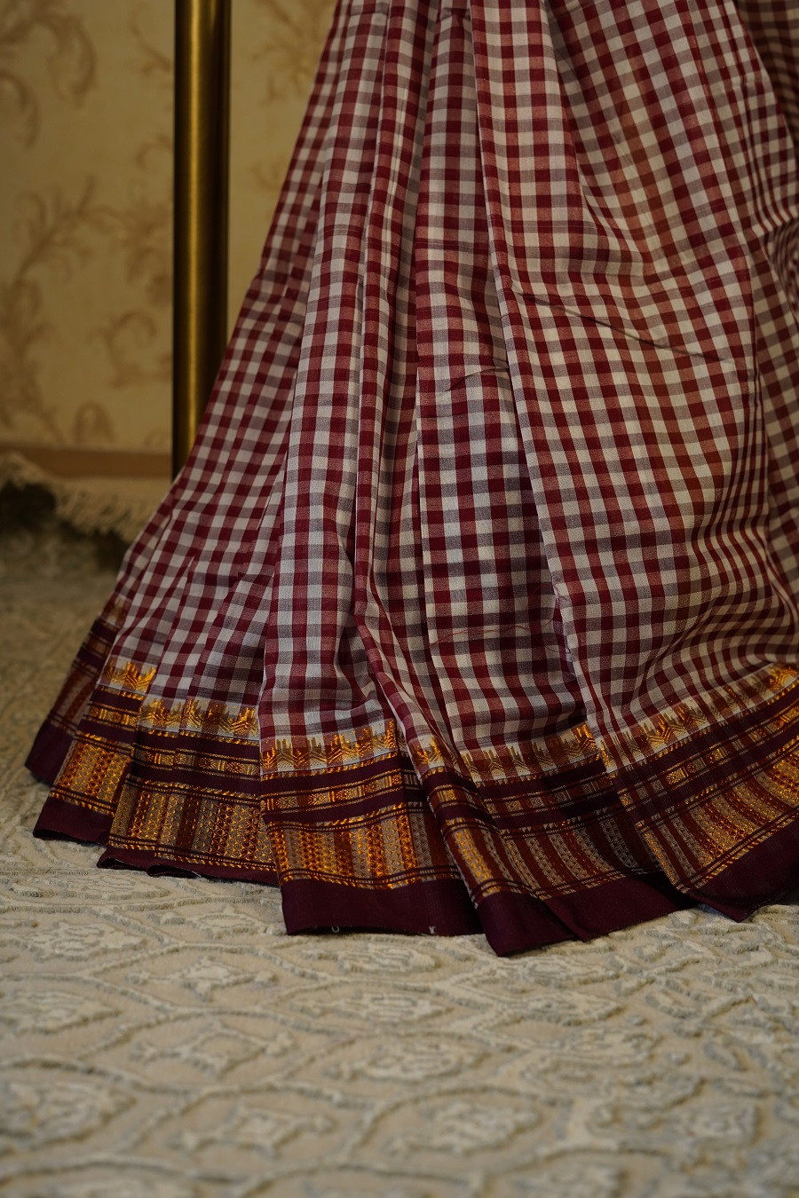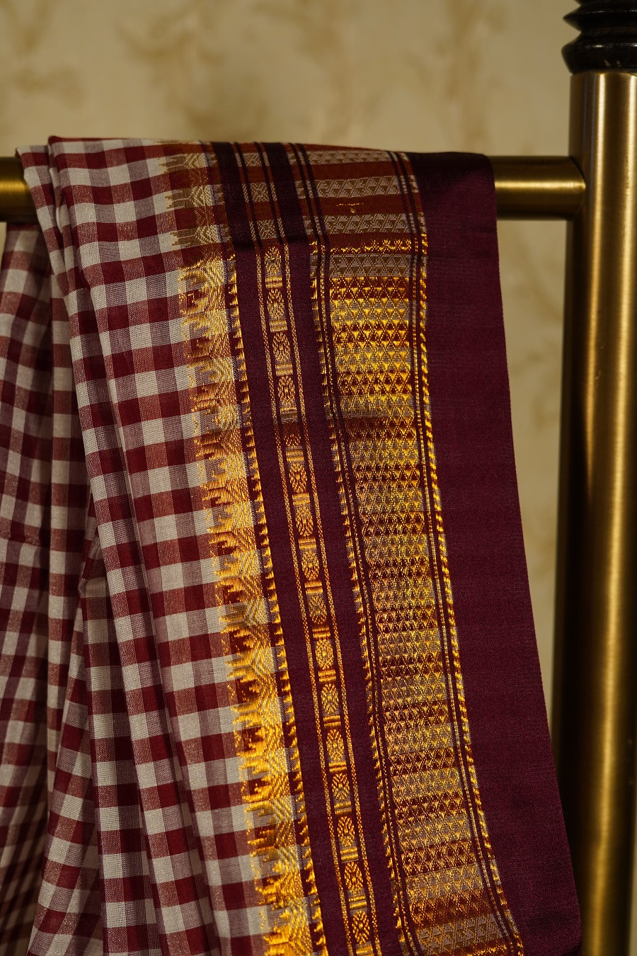 Crafted in a breathable cotton silk blend, the saree features a finely structured maroon and ivory checkered body - disciplined, elegant, and rich in traditional character. The deep maroon border and pallu are elevated with intricate zari detailing and signature temple-inspired motifs, lending ceremonial brilliance to the rhythmic pattern.