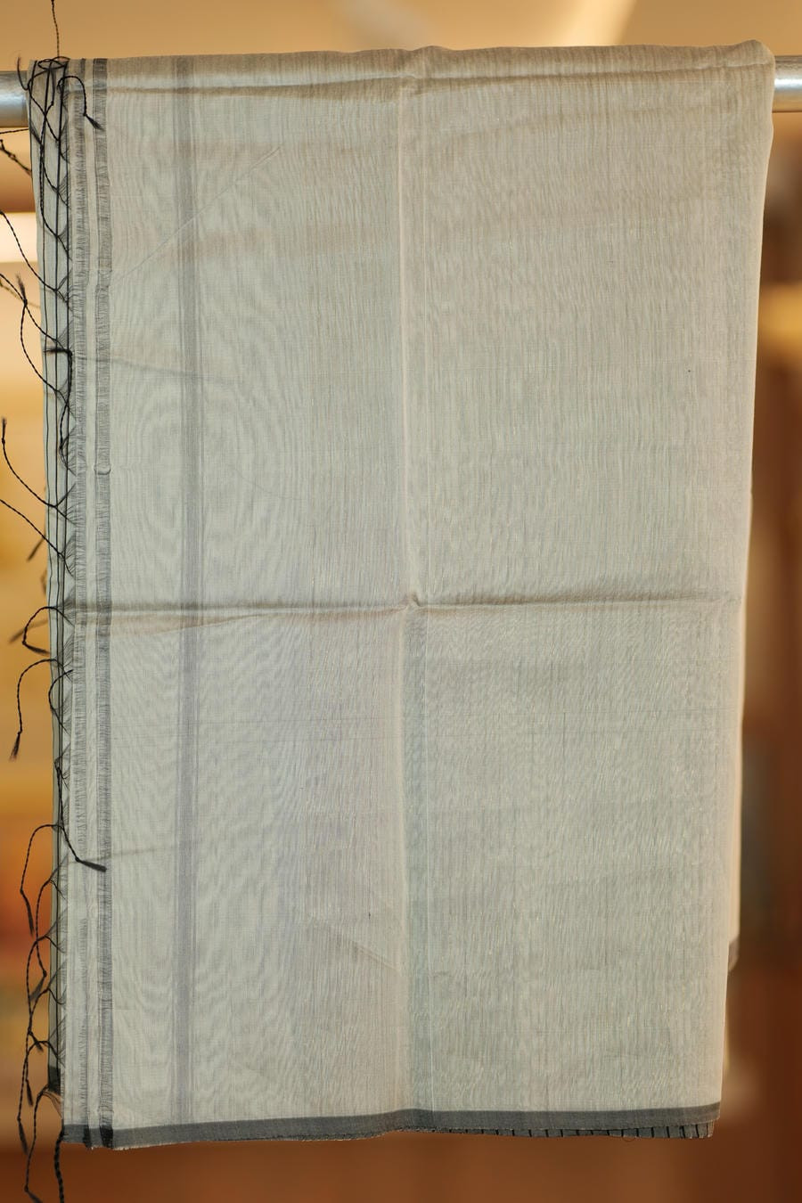 • Colour: Soft ivory-grey with fine stripe detailing and subtle silver-grey zari border