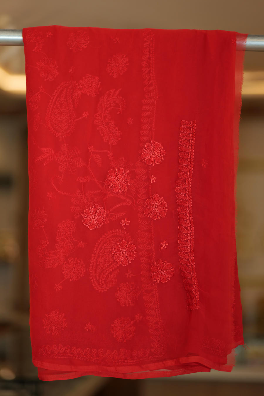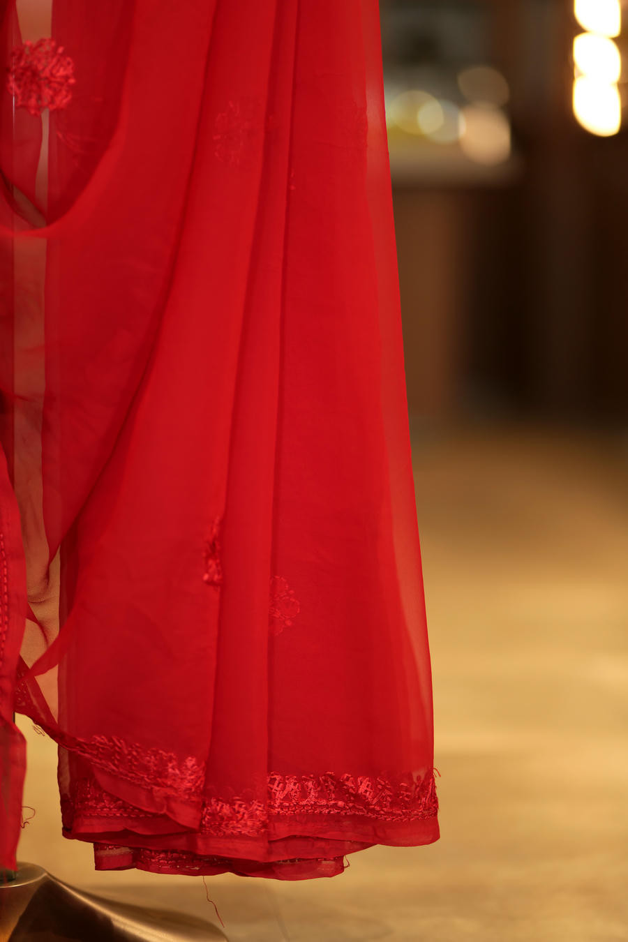 The absence of overt contrast allows the richness of the red and the finesse of the embroidery to take centre stage, resulting in a saree that feels regal yet restrained, opulent yet composed.