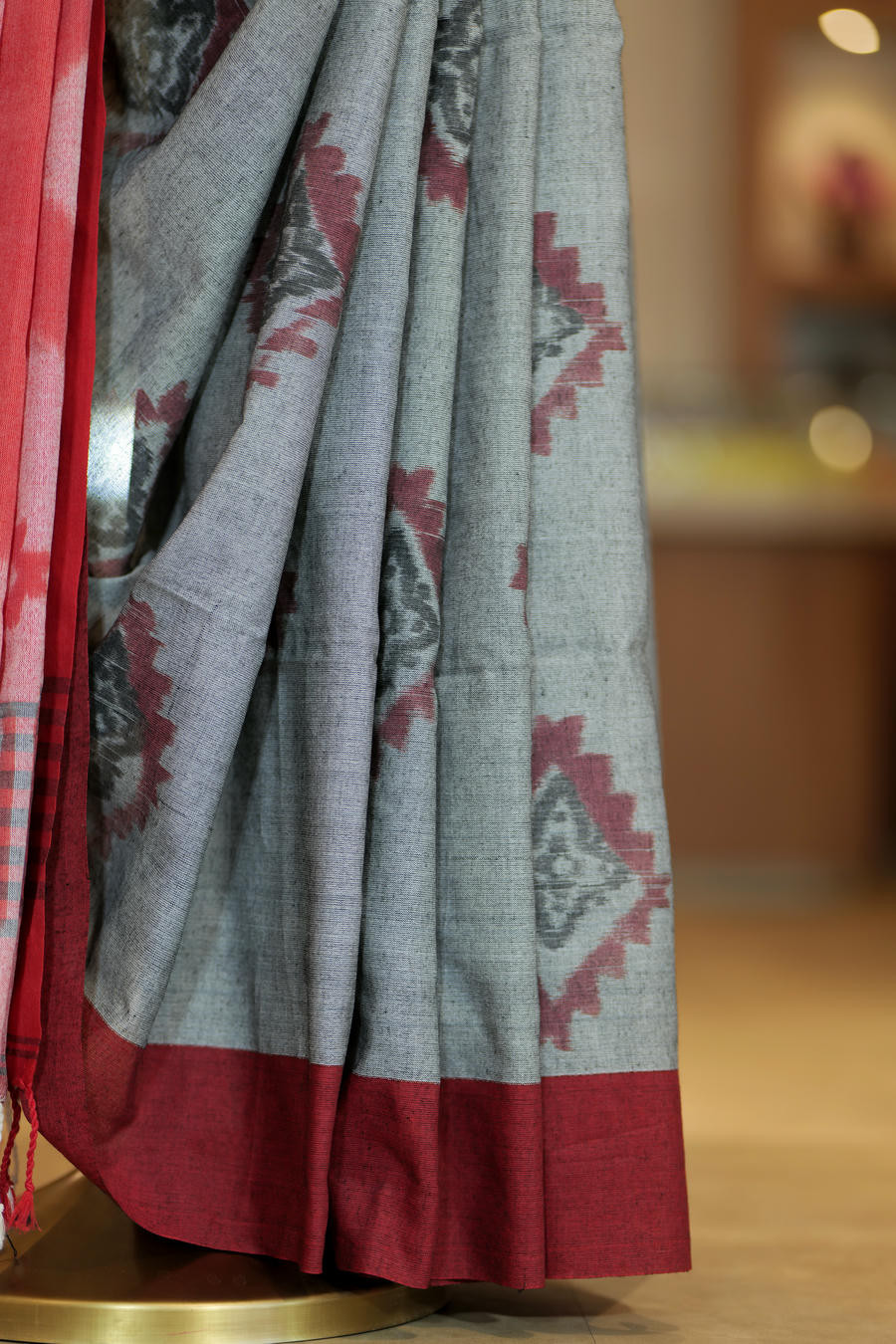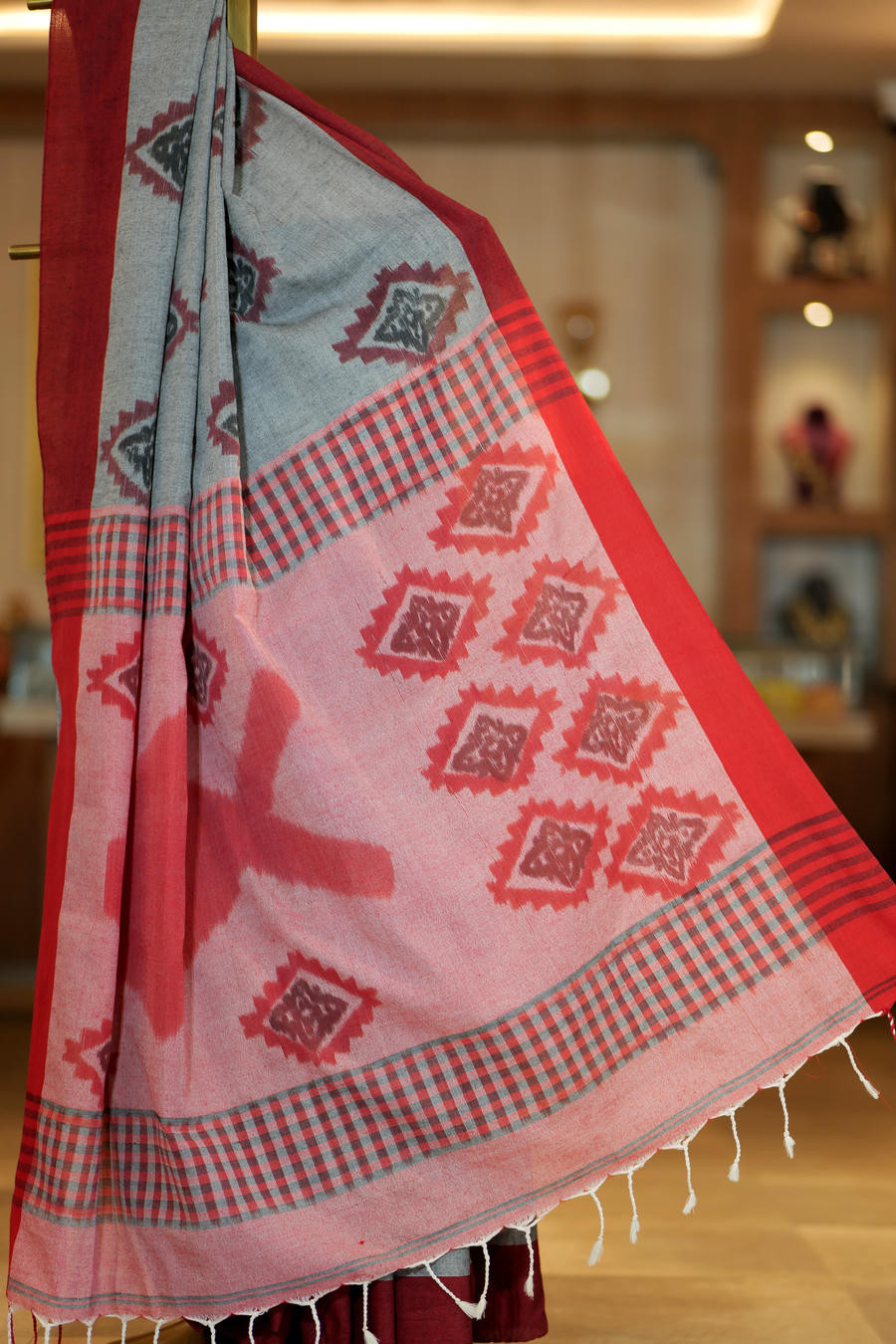 Grounded and expressive, The Rakt-Dhusor Sandesh is a pure cotton Kolkata saree that brings together contrast and calm in perfect balance. The soft grey body forms a composed canvas, patterned with rhythmic geometric motifs that echo Bengal's enduring design language.