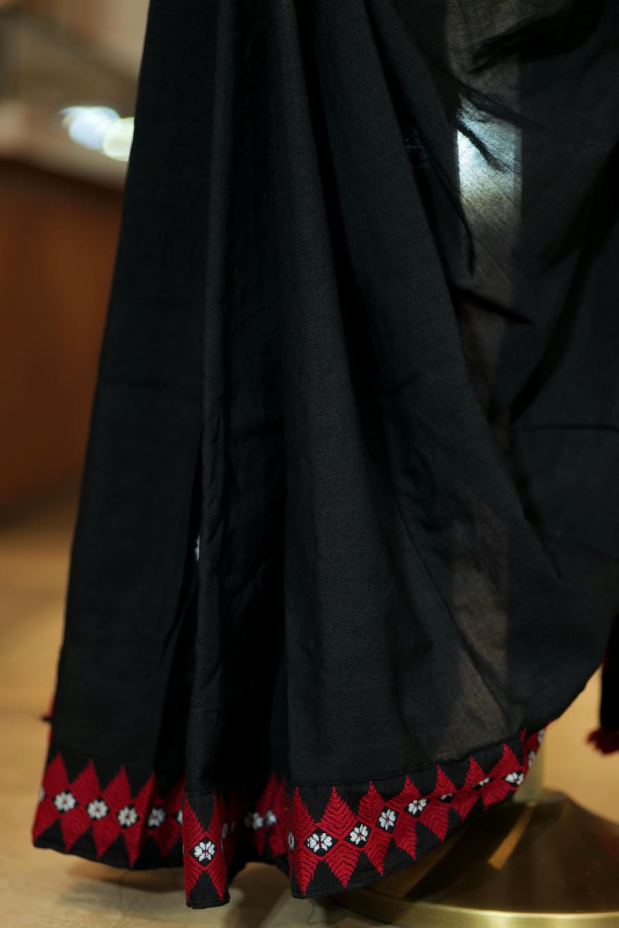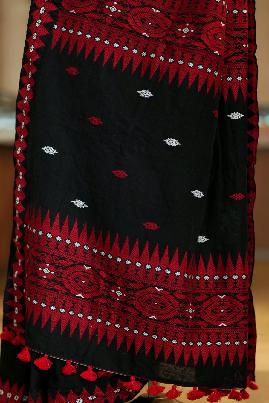 Woven in the looms of Assam, this pure cotton saree embodies quiet strength and timeless contrast. The deep black base is elevated by vivid red woven patterns that draw inspiration from traditional geometric forms, creating a look that is bold yet rooted in heritage.