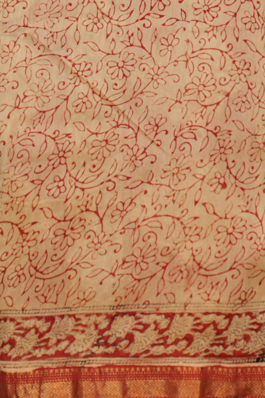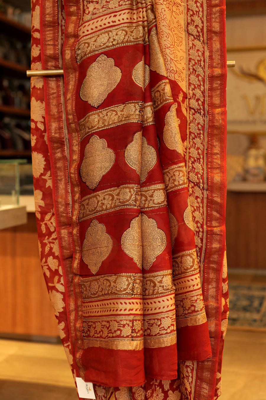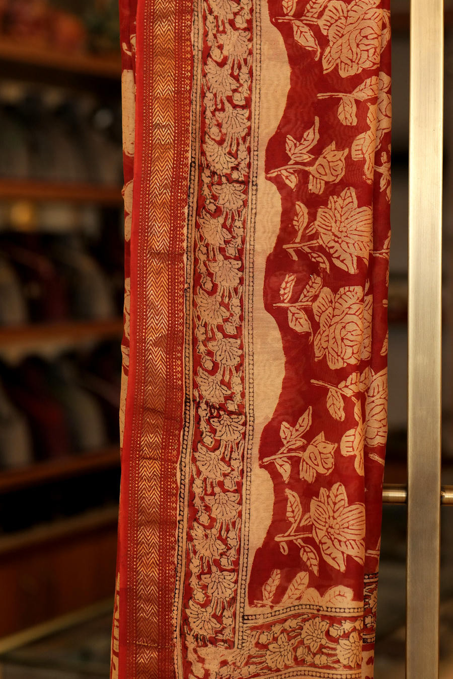 The deep red base is brought alive with layered handblock impressions, creating a balanced composition that feels both grounded and refined. Accented with subtle metallic borders, the saree carries a dignified presence without overpowering the hand-crafted essence of the textile.