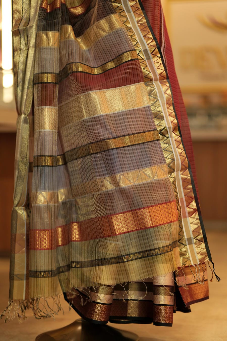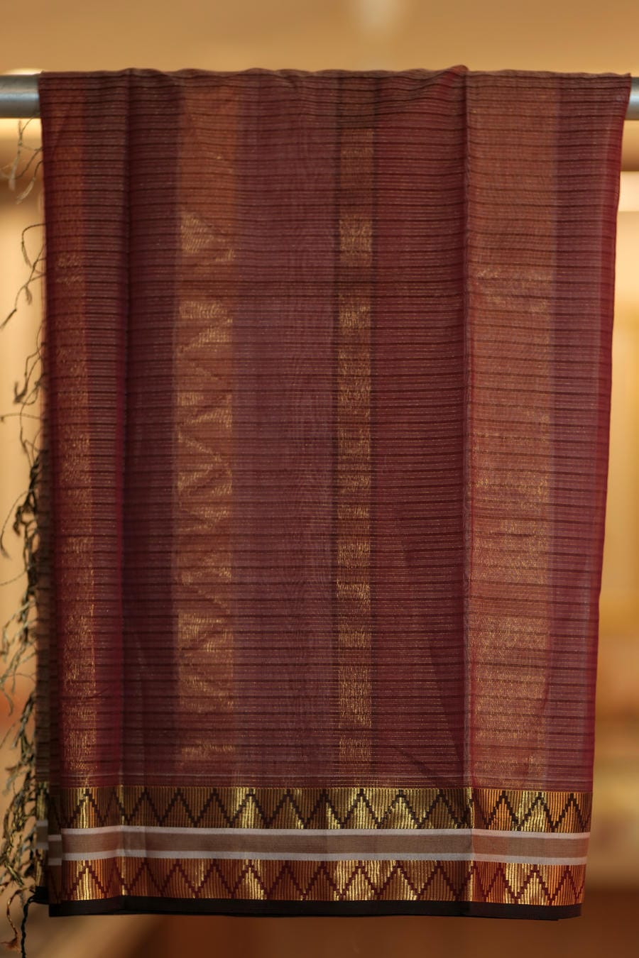 • Border & Pallu: Antique gold zari with geometric motifs