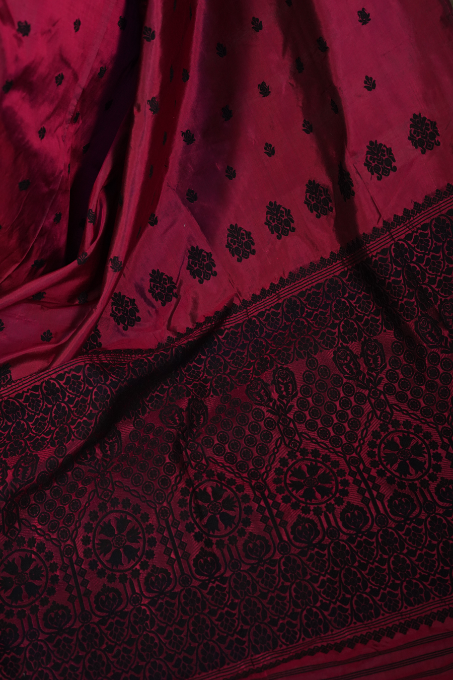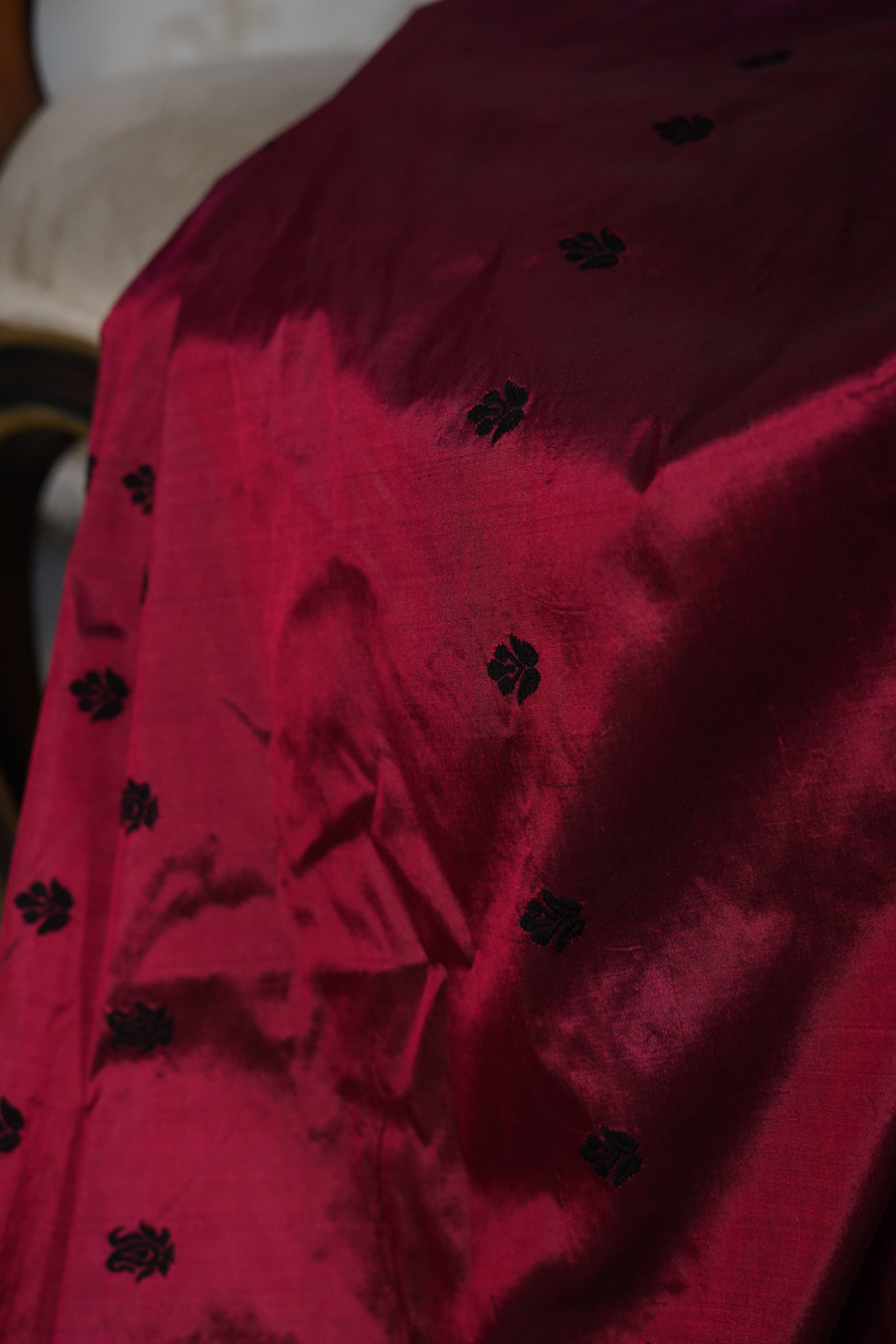 Crafted in silk, the fabric carries a natural sheen that enhances its deep, mature hue. Intricate woven detailing adds dimension and artistry, while the fluid drape allows the colour to unfold beautifully with every movement.