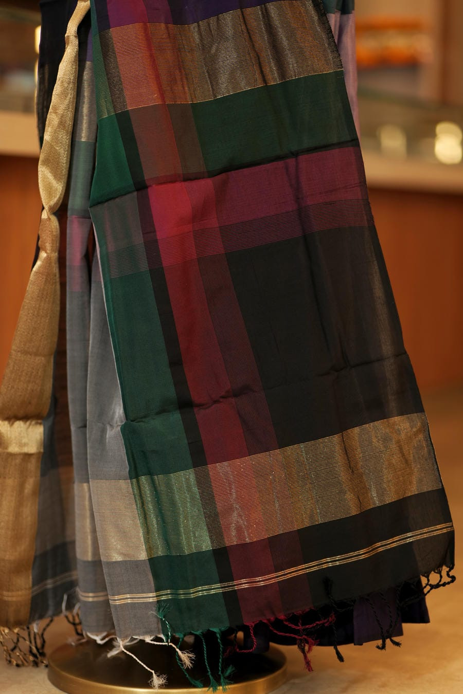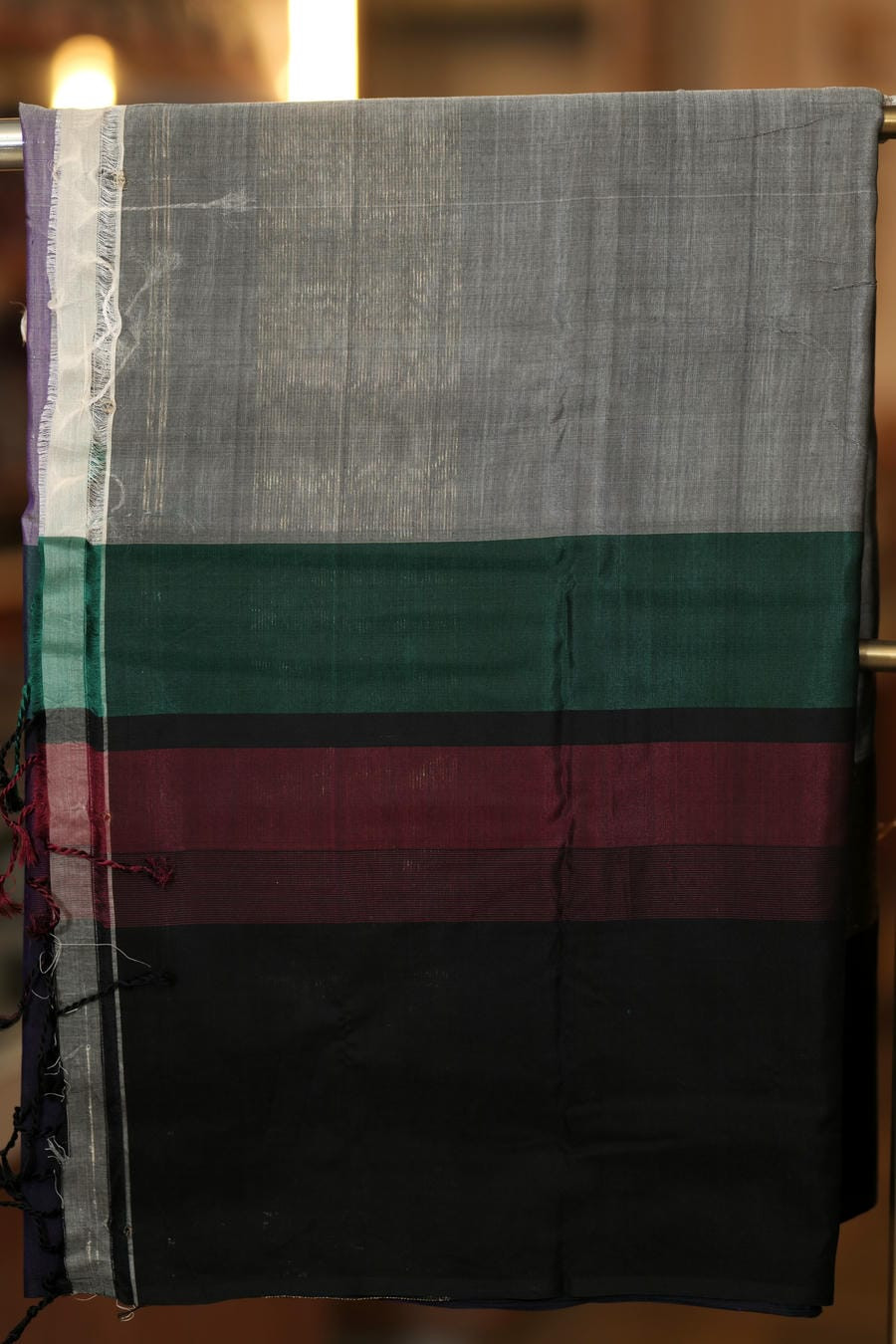 The border and pallu introduce a rich interplay of tones-charcoal grey, forest green, deep wine, and black-thoughtfully arranged to create depth and visual rhythm. Crafted in the traditional Maheshwari weave, the saree remains lightweight and breathable with a fluid drape, perfect for long hours of graceful wear. Subtle gold detailing along the edges adds a quiet festive glow without overwhelming the design.