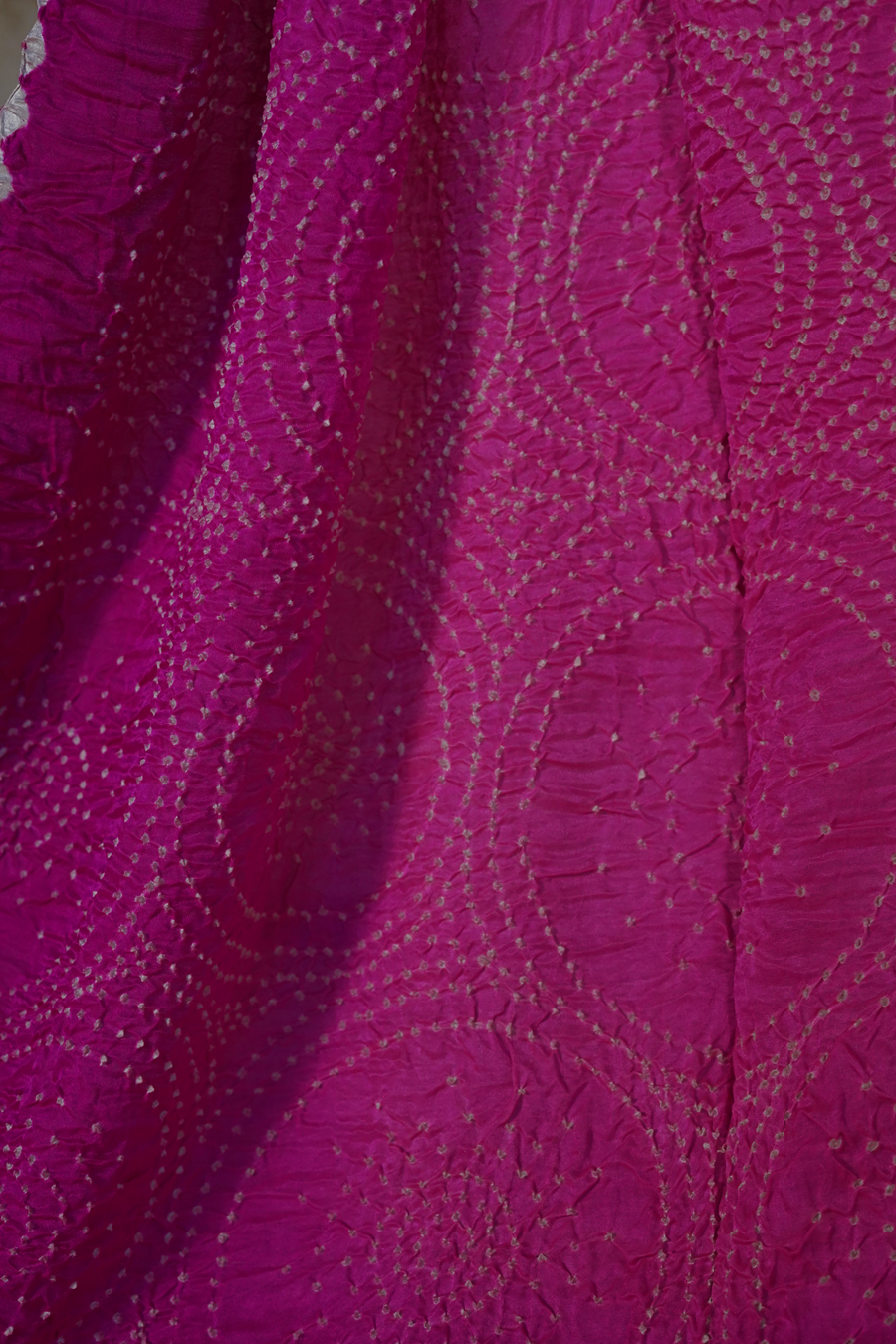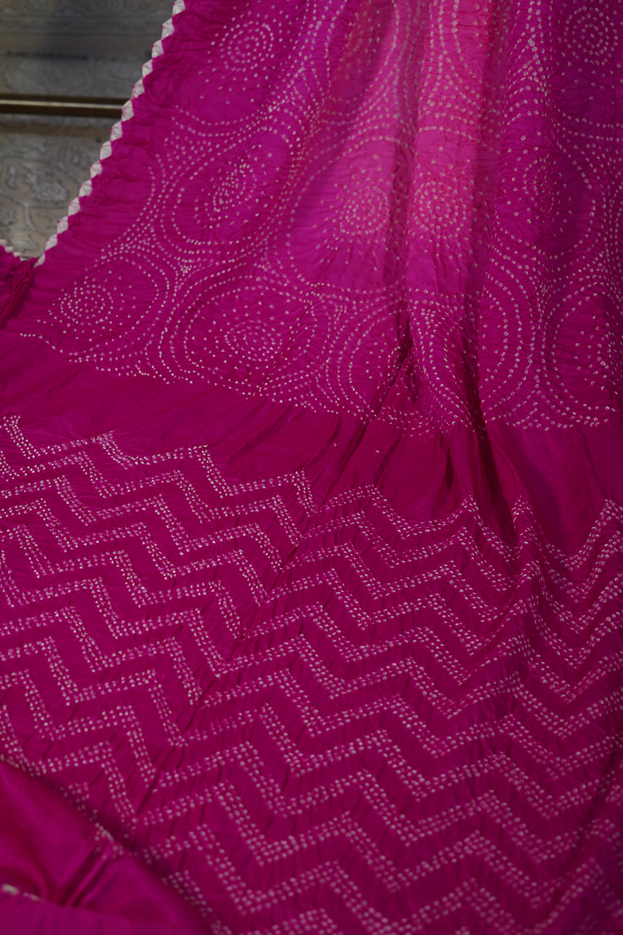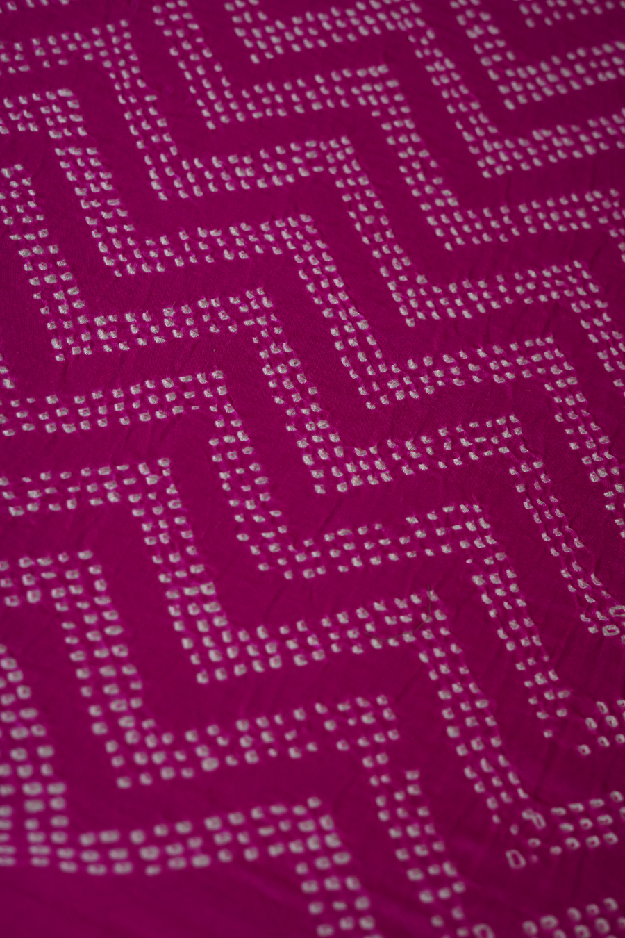 Crafted in soft, flowy pure georgette, this saree drapes effortlessly, offering a light and graceful fall. The intense rani-pink base is adorned with intricate hand-tied Bandhej patterns flowing across the body in rhythmic circular formations. The lower drape features striking chevron-inspired detailing, adding movement and visual depth to its classic craft.